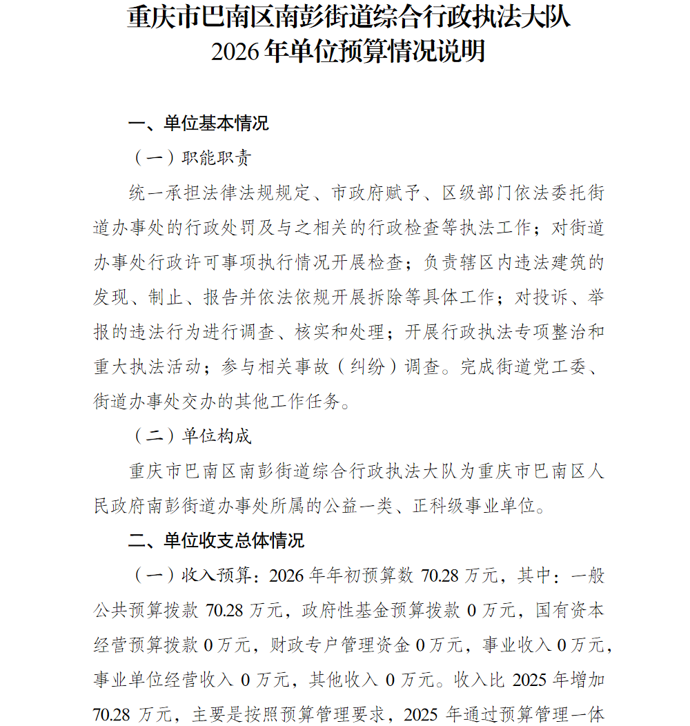 重庆市巴南区南彭街道综合行政执法大队2026年单位预算情况说明