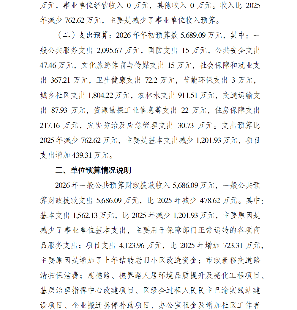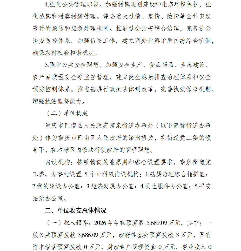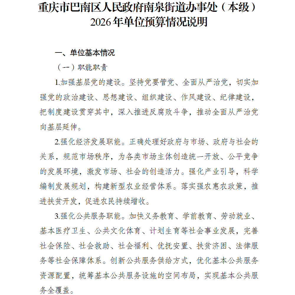 重庆市巴南区人民政府南泉街道办事处(本级)2026年单位预算情况说明及附表