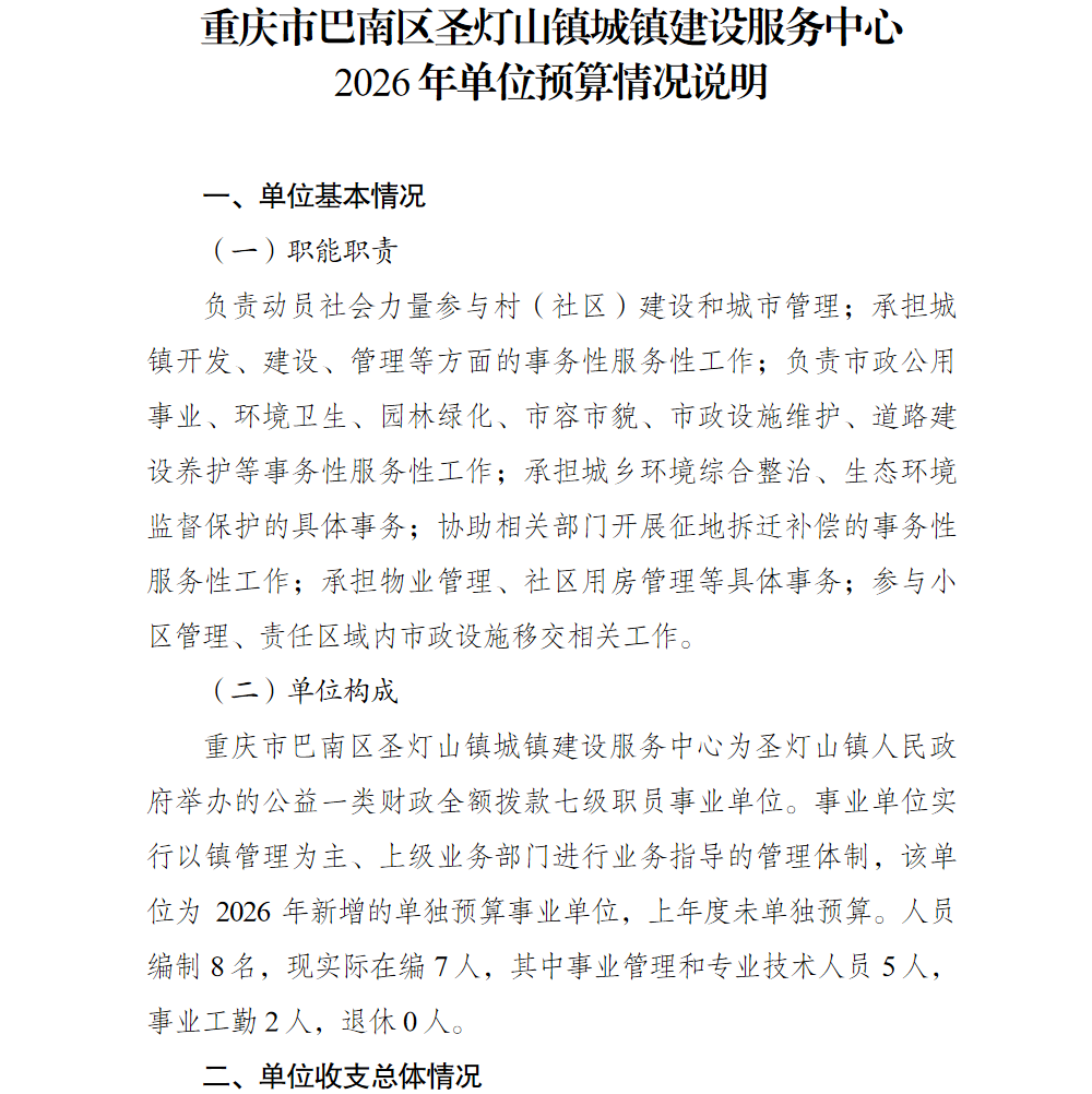重庆市巴南区圣灯山镇城镇建设服务中心2026年单位预算情况说明