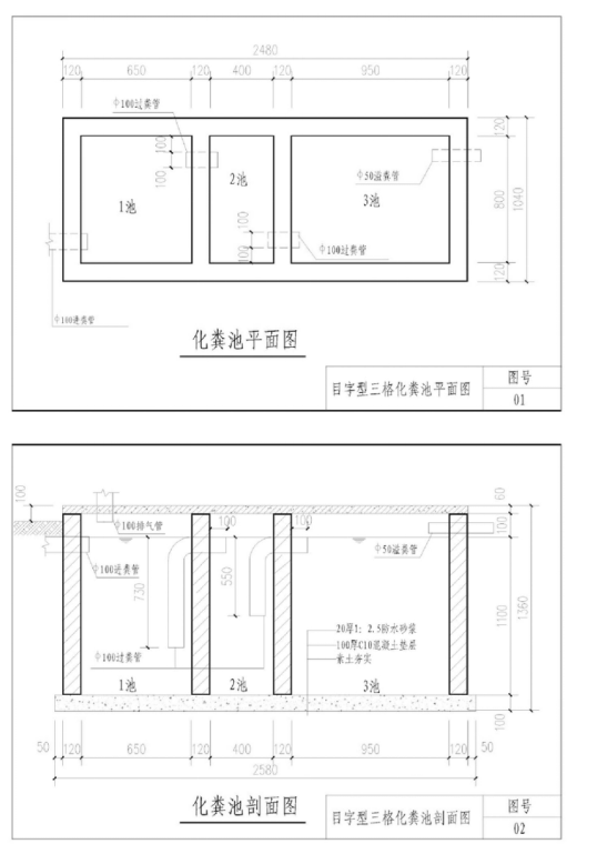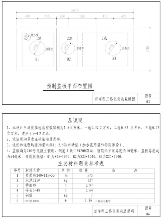 6.盖板安装:三格化粪池要用水泥捣制的盖板密封处理,盖板厚度厚度不小于6cm,盖板必须留有一、二、三池清渣口、取粪口并加盖板密封,直径不应小于200mm。三格式化粪池顶部应设置清渣口和清粪口,直径不应小于20cm,第三池清粪口可根据清掏方式适当扩大。