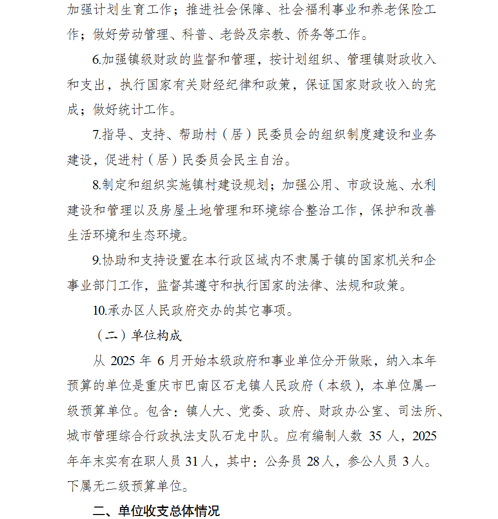 重庆市巴南区石龙镇人民政府(本级)2026年部门预算情况说明