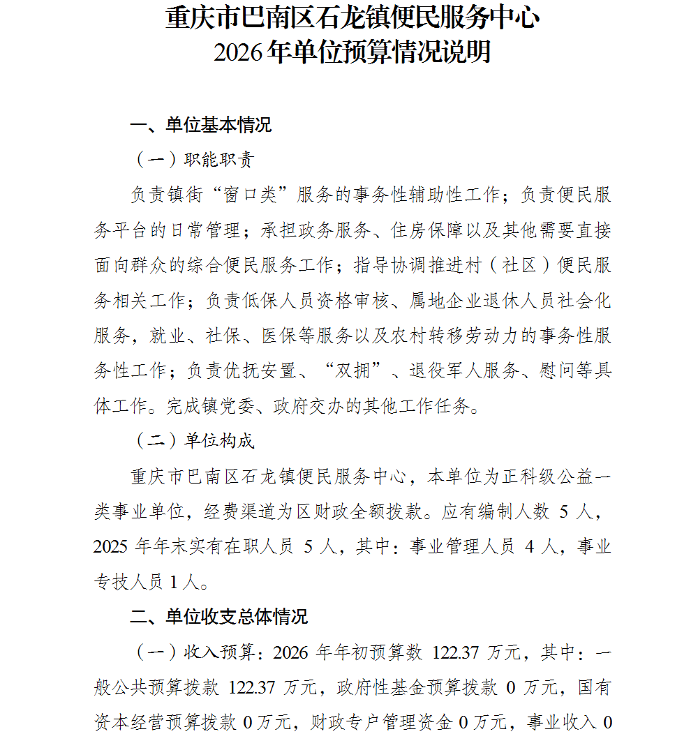 重庆市巴南区石龙镇便民服务中心2026年部门预算情况说明