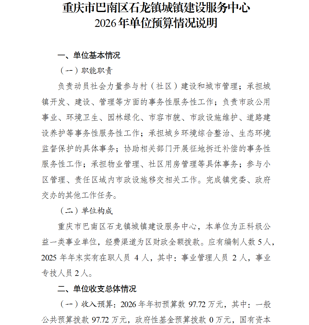 重庆市巴南区石龙镇城镇建设服务中心2026年部门预算情况说明