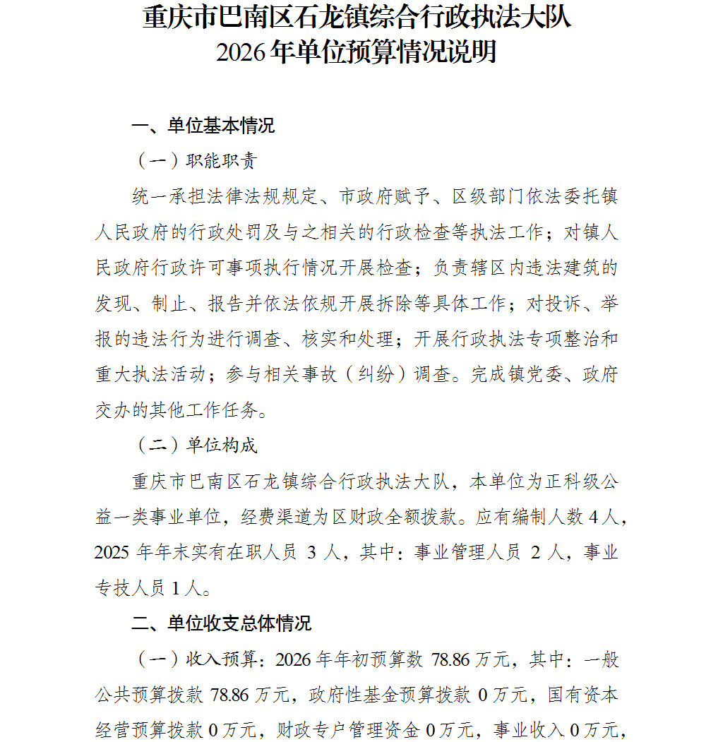 重庆市巴南区石龙镇综合行政执法大队2026年部门预算情况说明