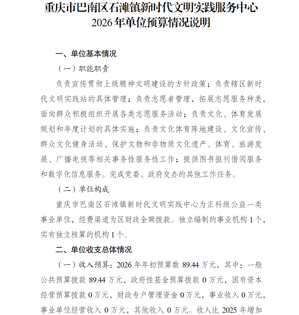重庆市巴南区石滩镇新时代文明实践服务中心2026年部门预算情况说明