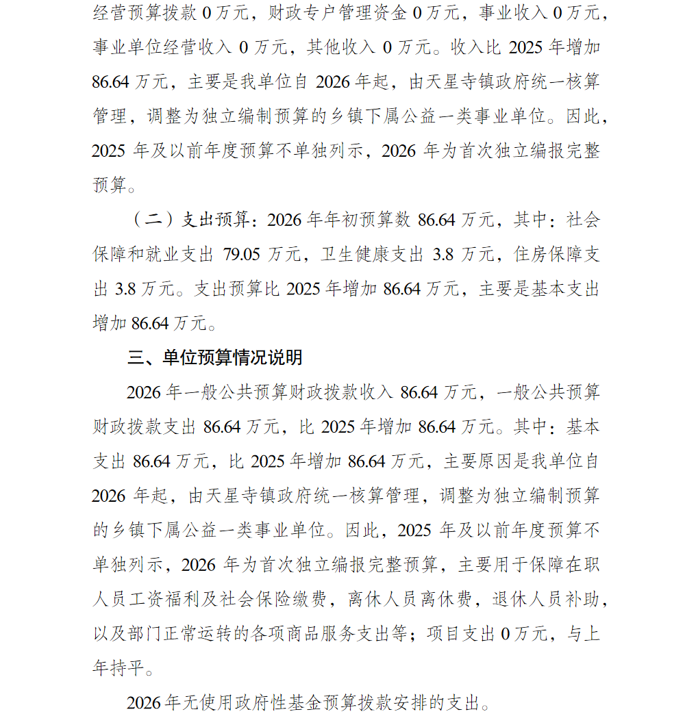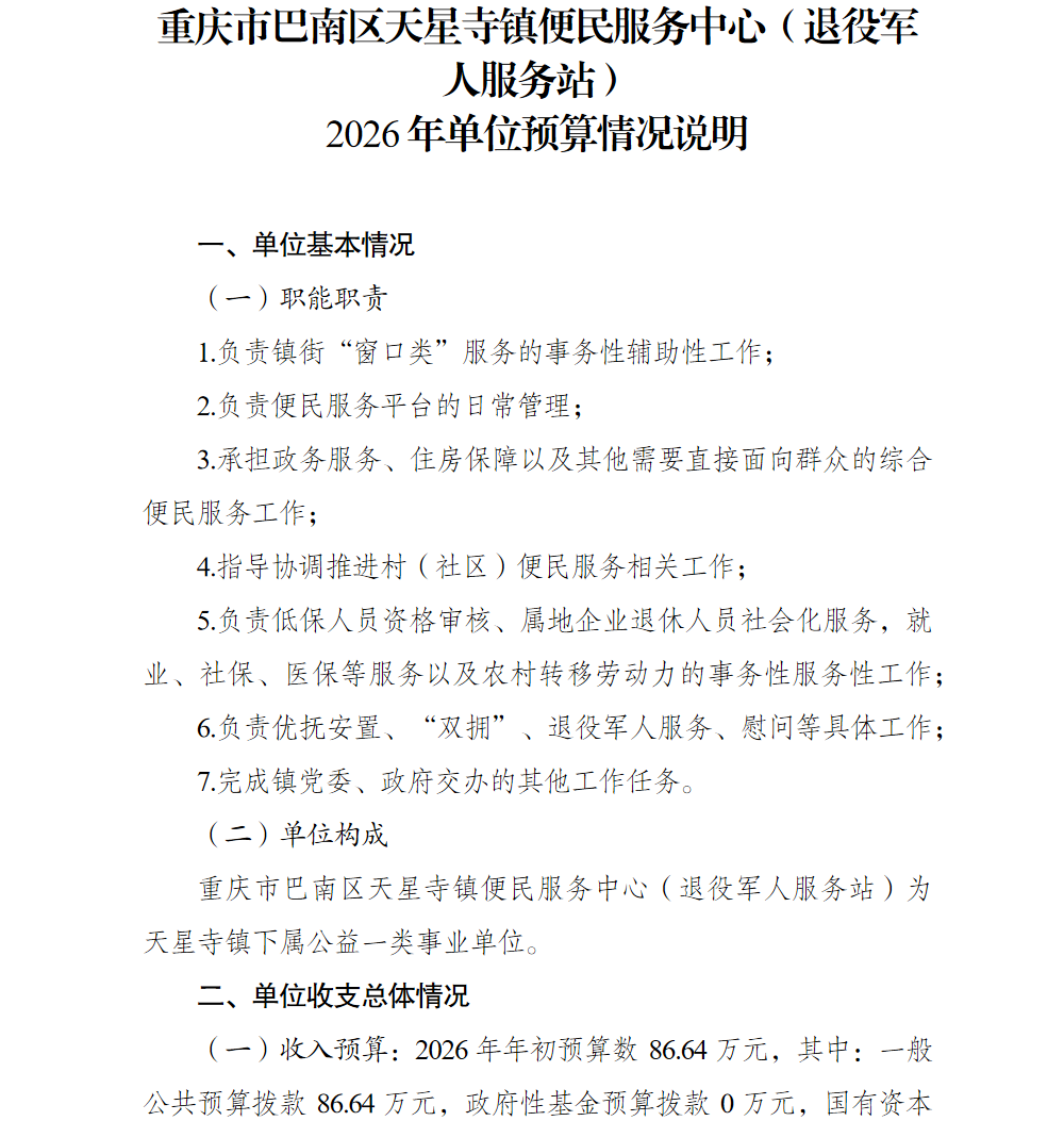 重庆市巴南区天星寺镇便民服务中心(退役军人服务站)2026年单位预算情况说明