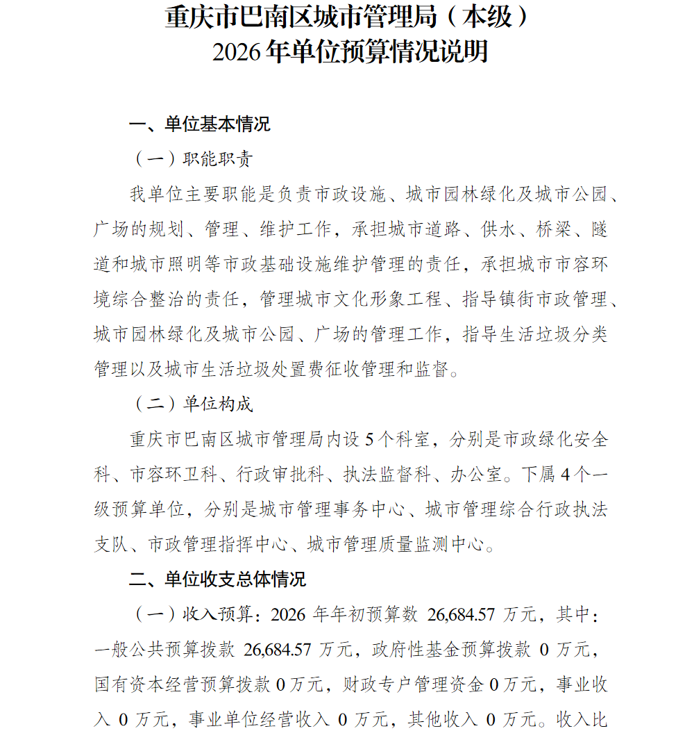 重庆市巴南区城市管理局(本级)2026年单位预算情况说明