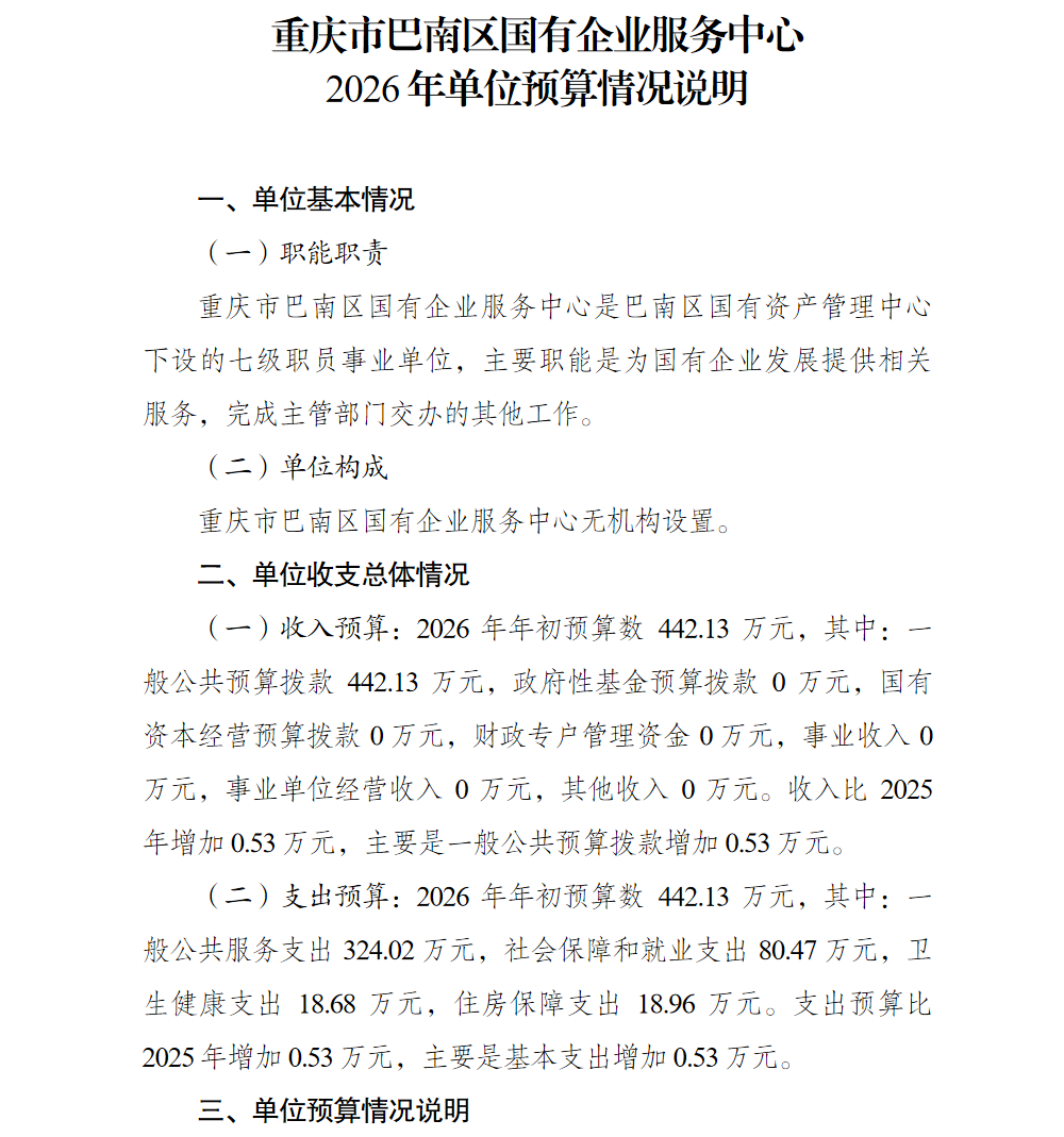 重庆市巴南区国有企业服务中心2026年单位预算情况说明及附表