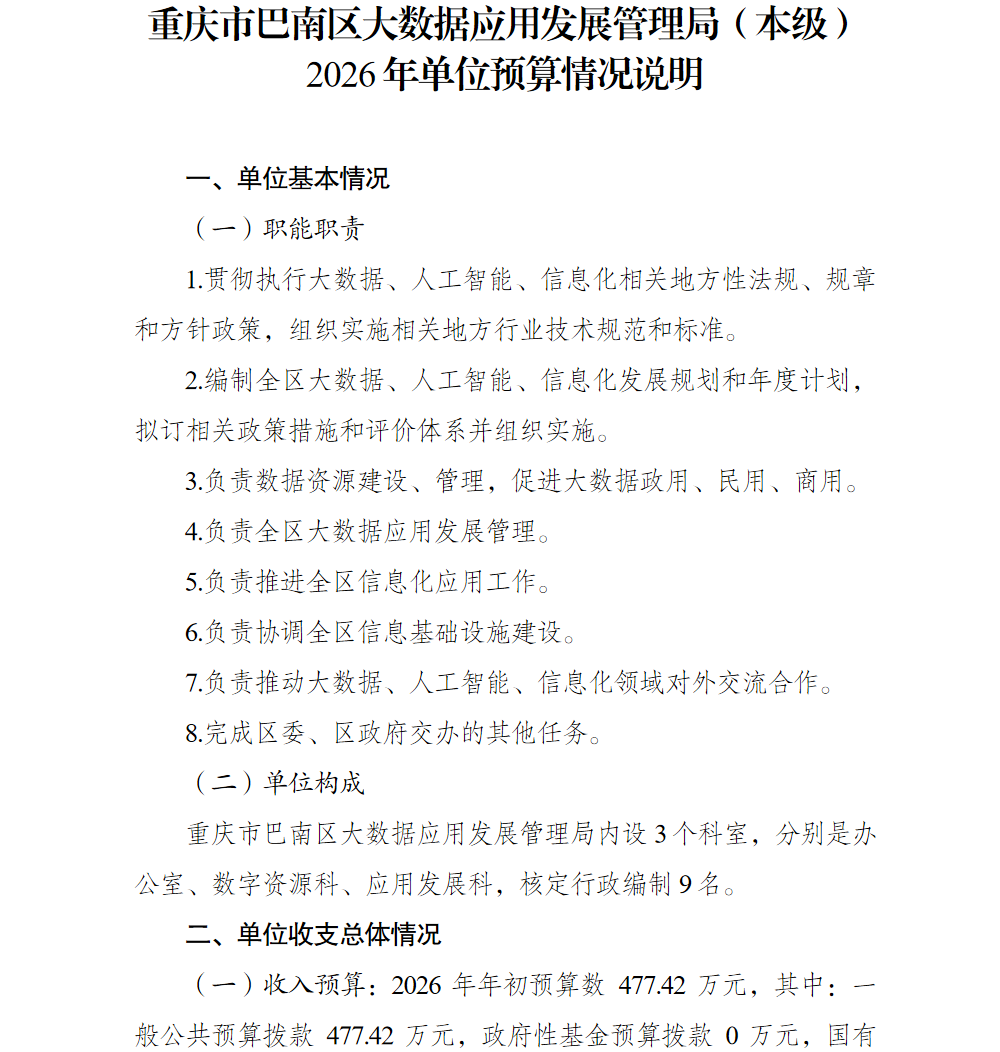 重庆市巴南区大数据应用发展管理局(本级)2026年单位预算情况说明