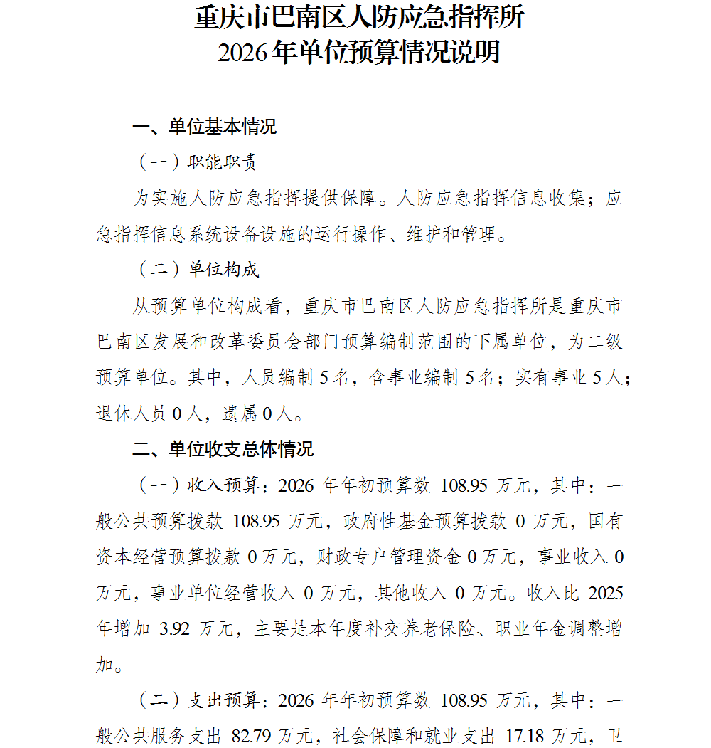 重庆市巴南区人防应急指挥所2026年单位预算情况说明