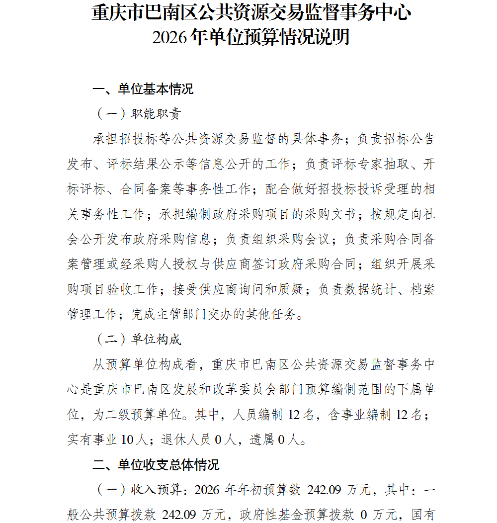 重庆市巴南区公共资源交易监督事务中心2026年单位预算情况说明