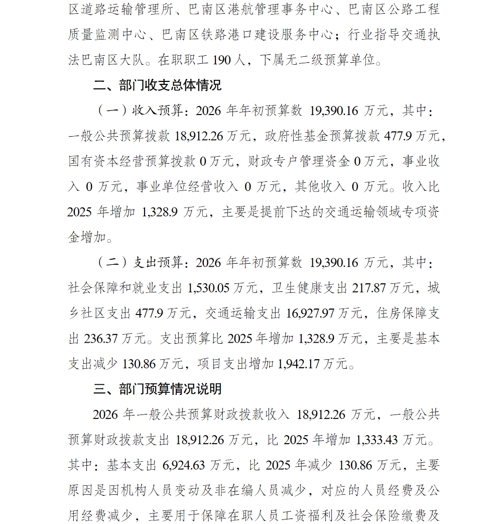 重庆市巴南区交通运输委员会2026年部门预算情况说明(汇总级和本级)