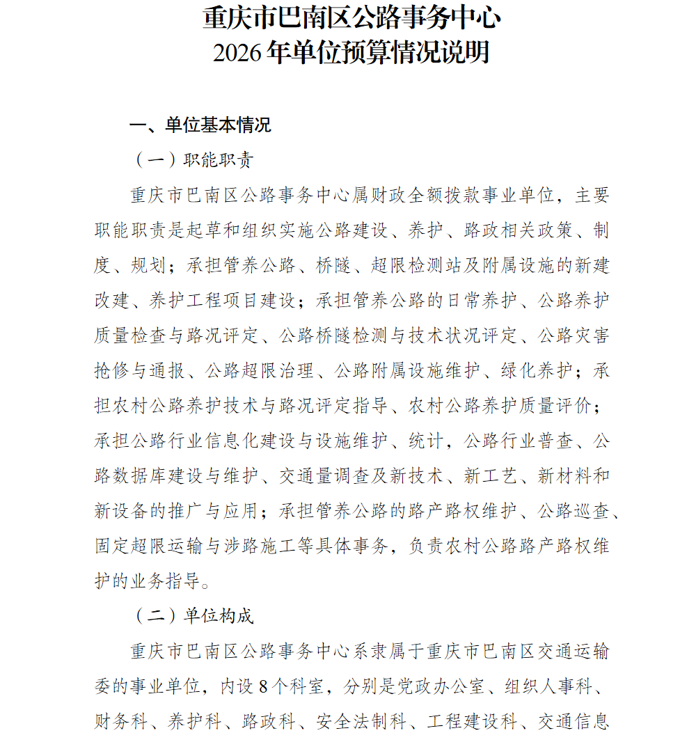 重庆市巴南区公路事务中心2026年单位预算情况说明