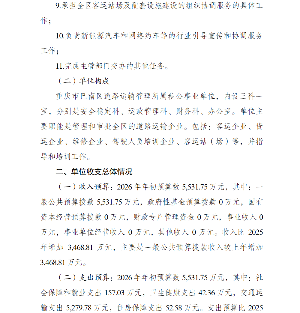 重庆市巴南区道路运输管理所2026年单位预算情况说明