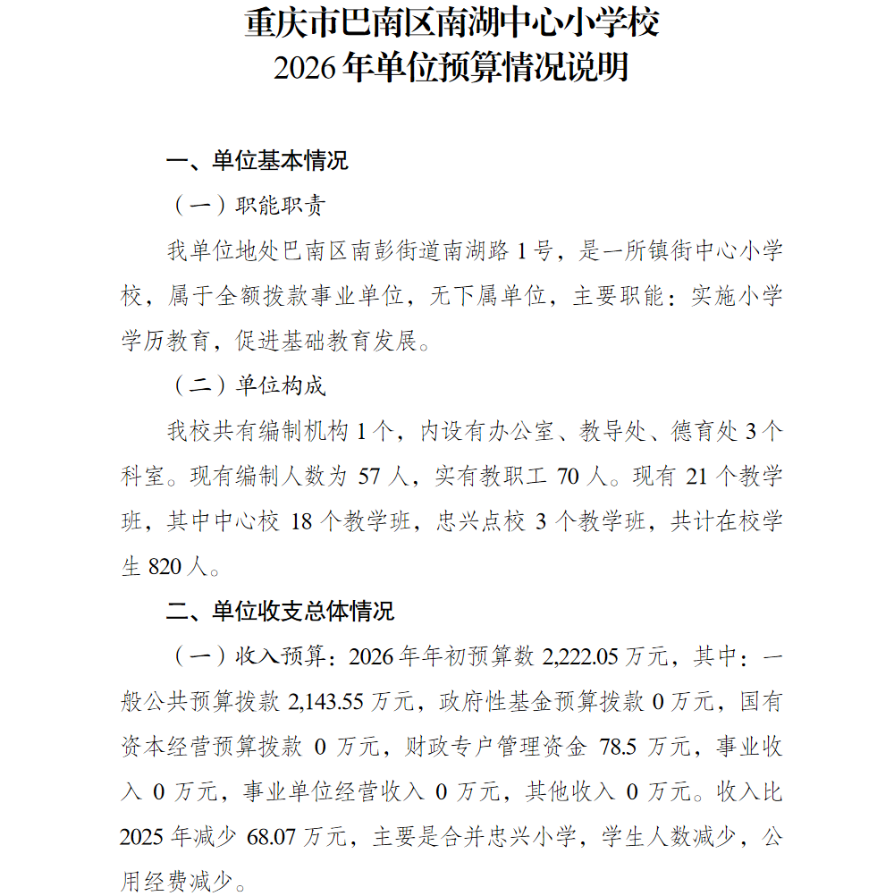 重庆市巴南区南湖中心小学校2026年单位预算情况说明