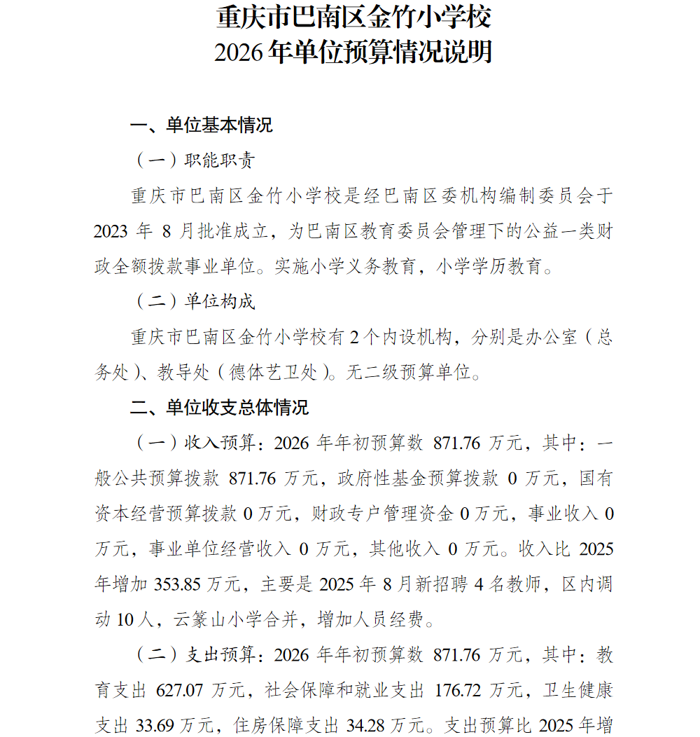 重庆市巴南区金竹小学校2026年单位预算情况说明