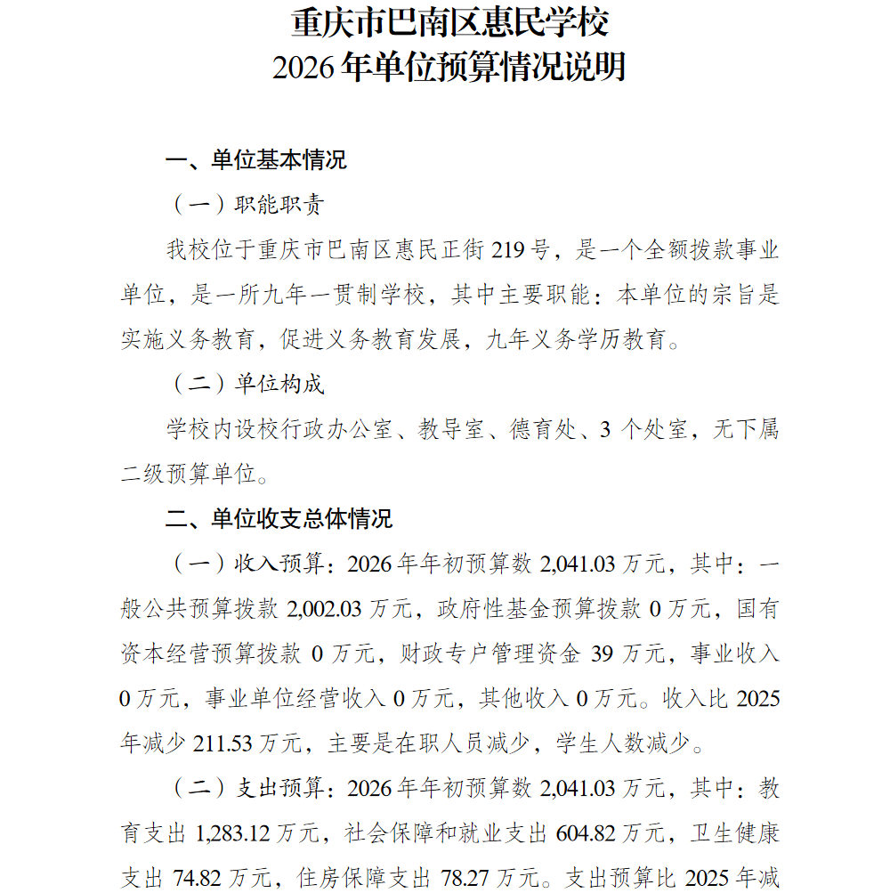 重庆市巴南区惠民学校2026年单位预算情况说明
