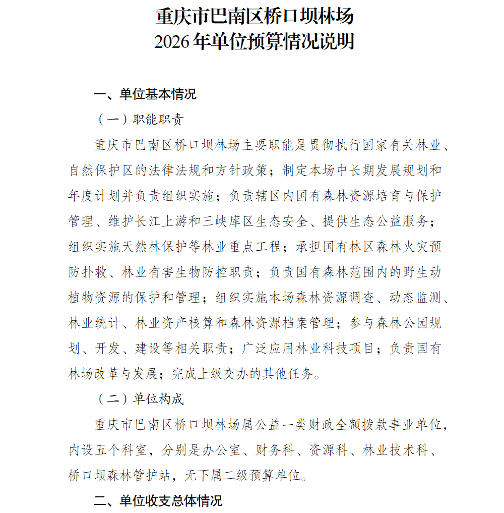 重庆市巴南区桥口坝林场2026年单位预算情况说明
