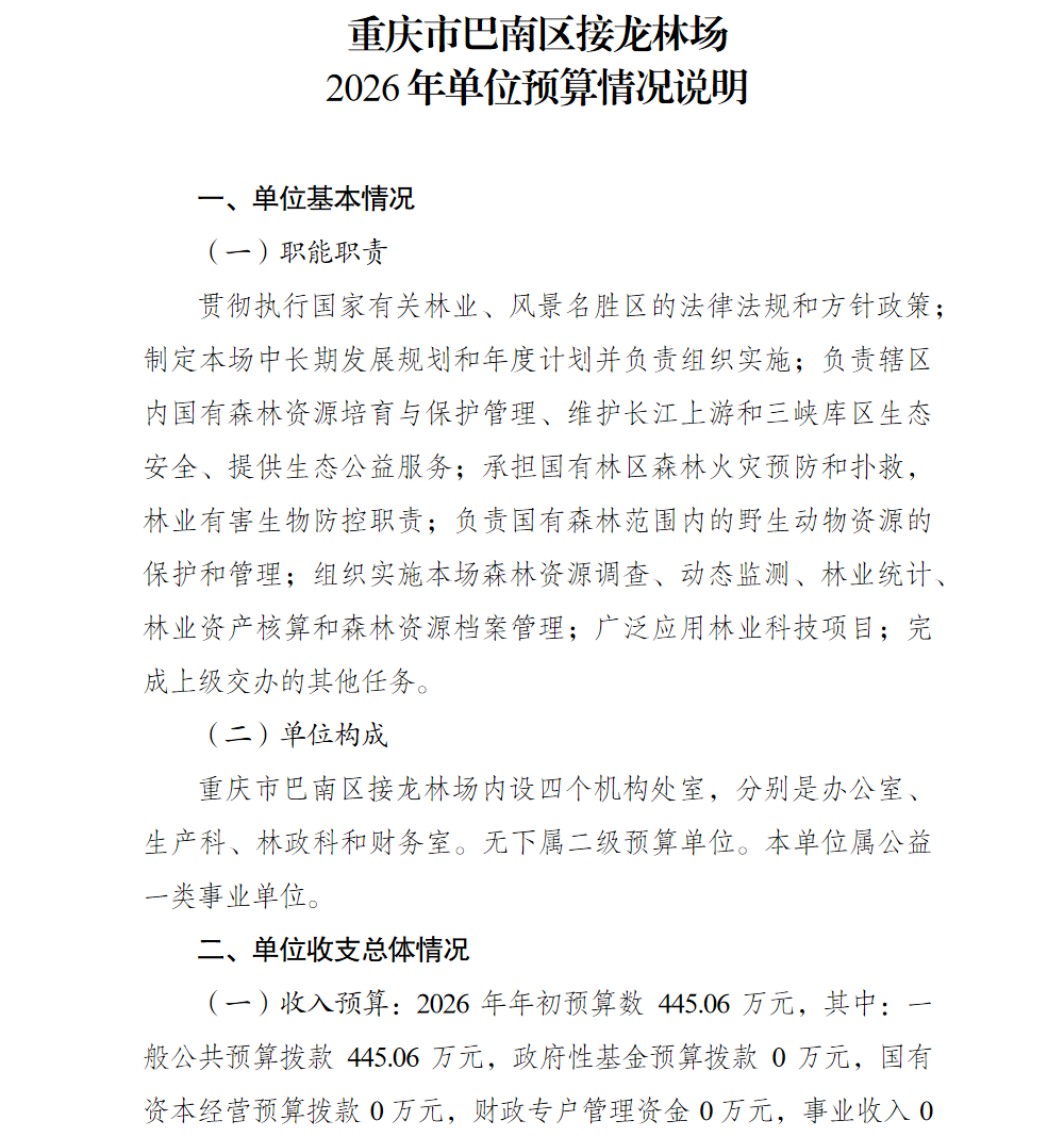 重庆市巴南区接龙林场2026年单位预算情况说明
