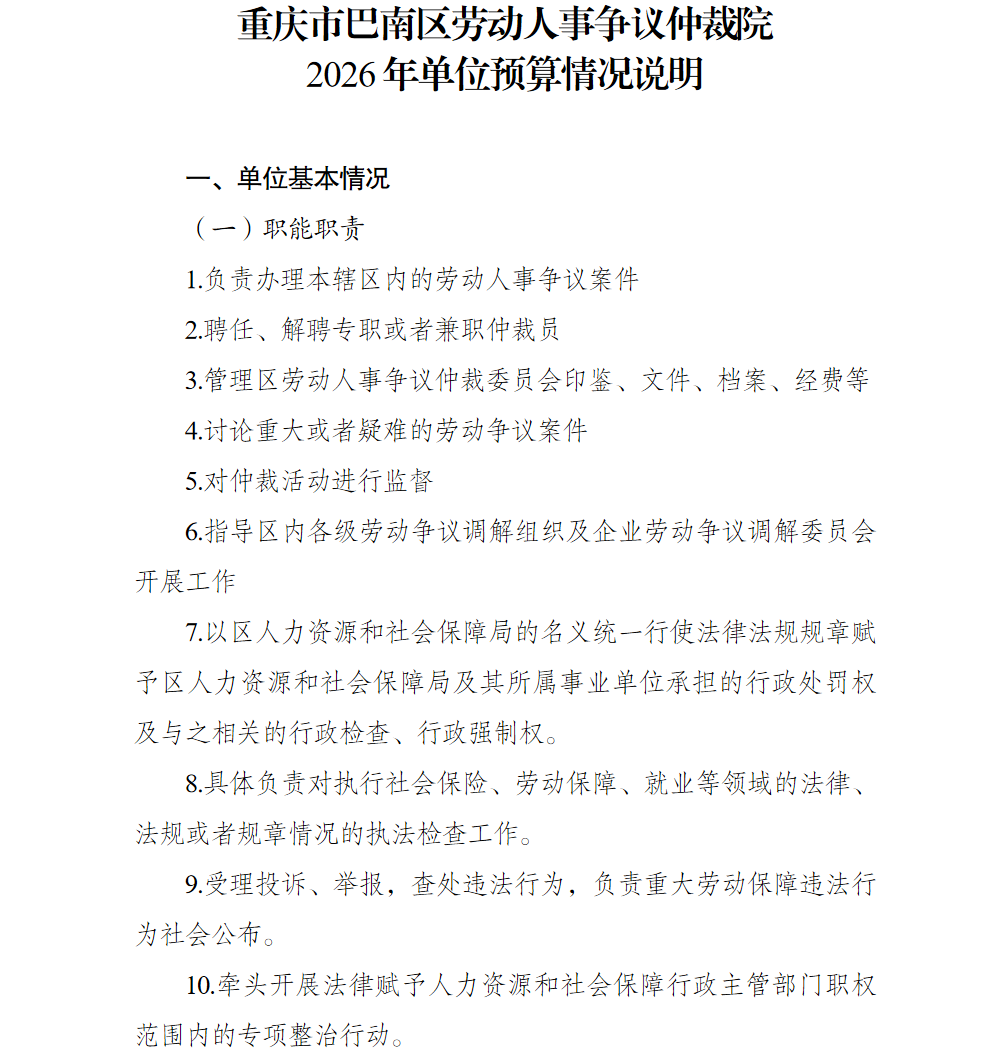 重庆市巴南区劳动人事争议仲裁院 2026 年单位预算情况说明