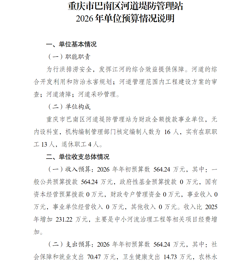 重庆市巴南区河道堤防管理站2026年单位预算情况说明
