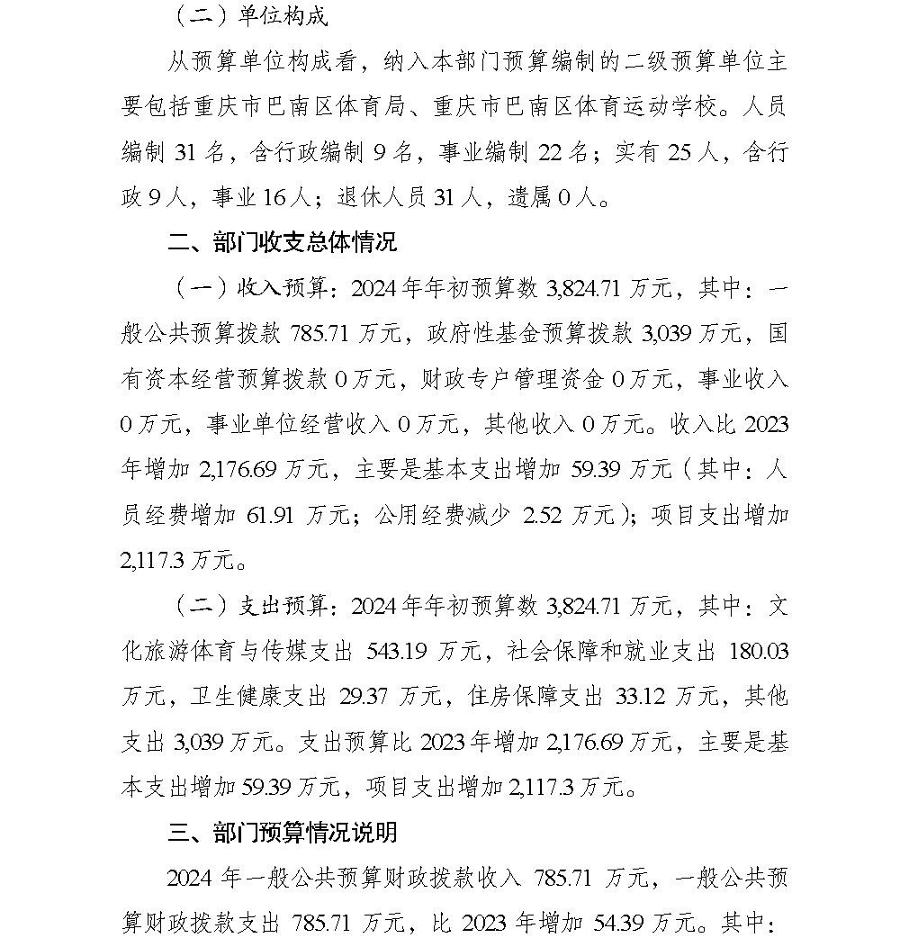 重庆市巴南区体育局2024年部门预算情况说明(汇总级和本级)