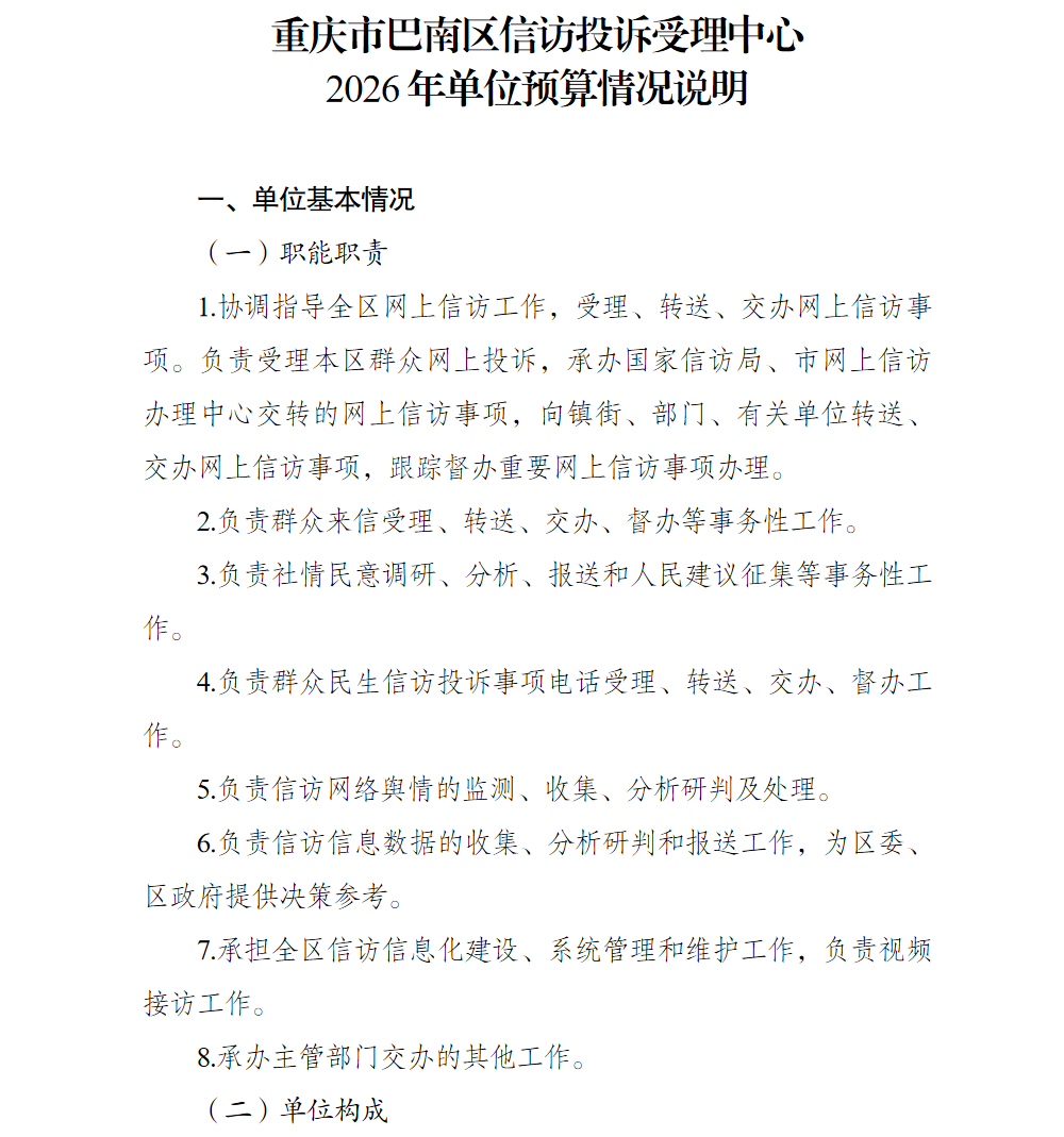 重庆市巴南区信访投诉受理中心2026年单位预算情况说明