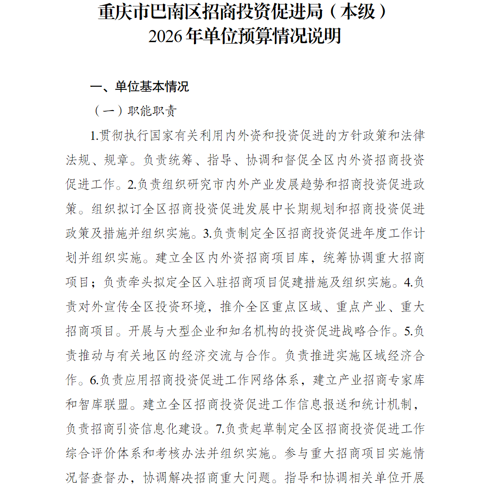重庆市巴南区招商投资促进局(本级)2026年单位预算情况说明