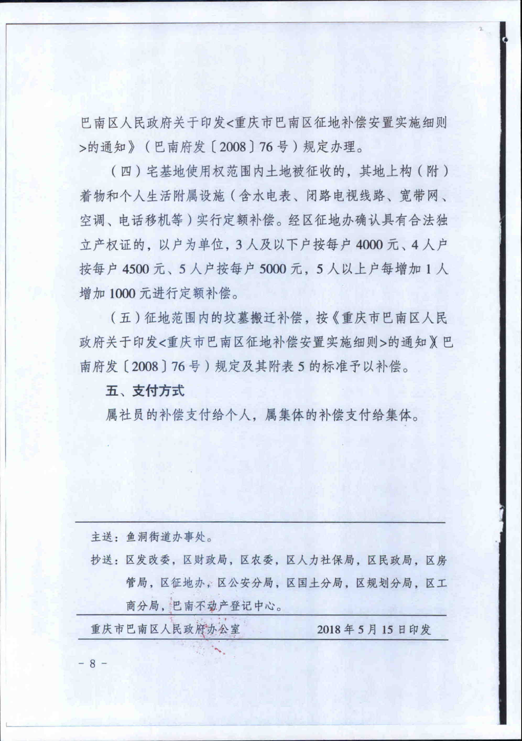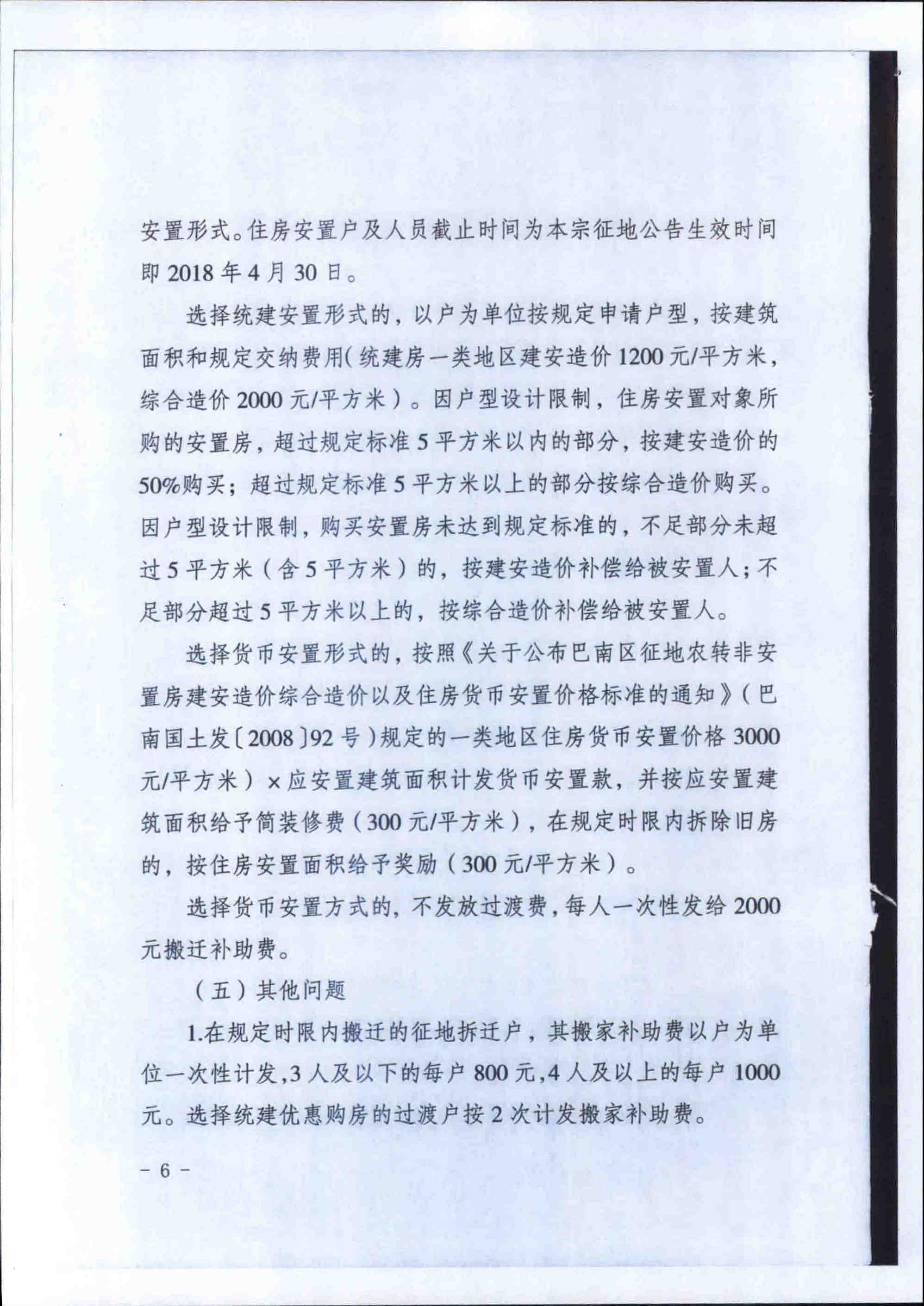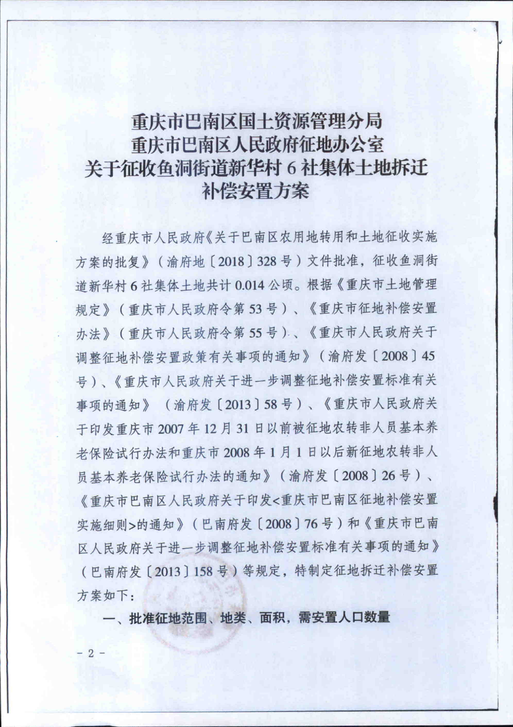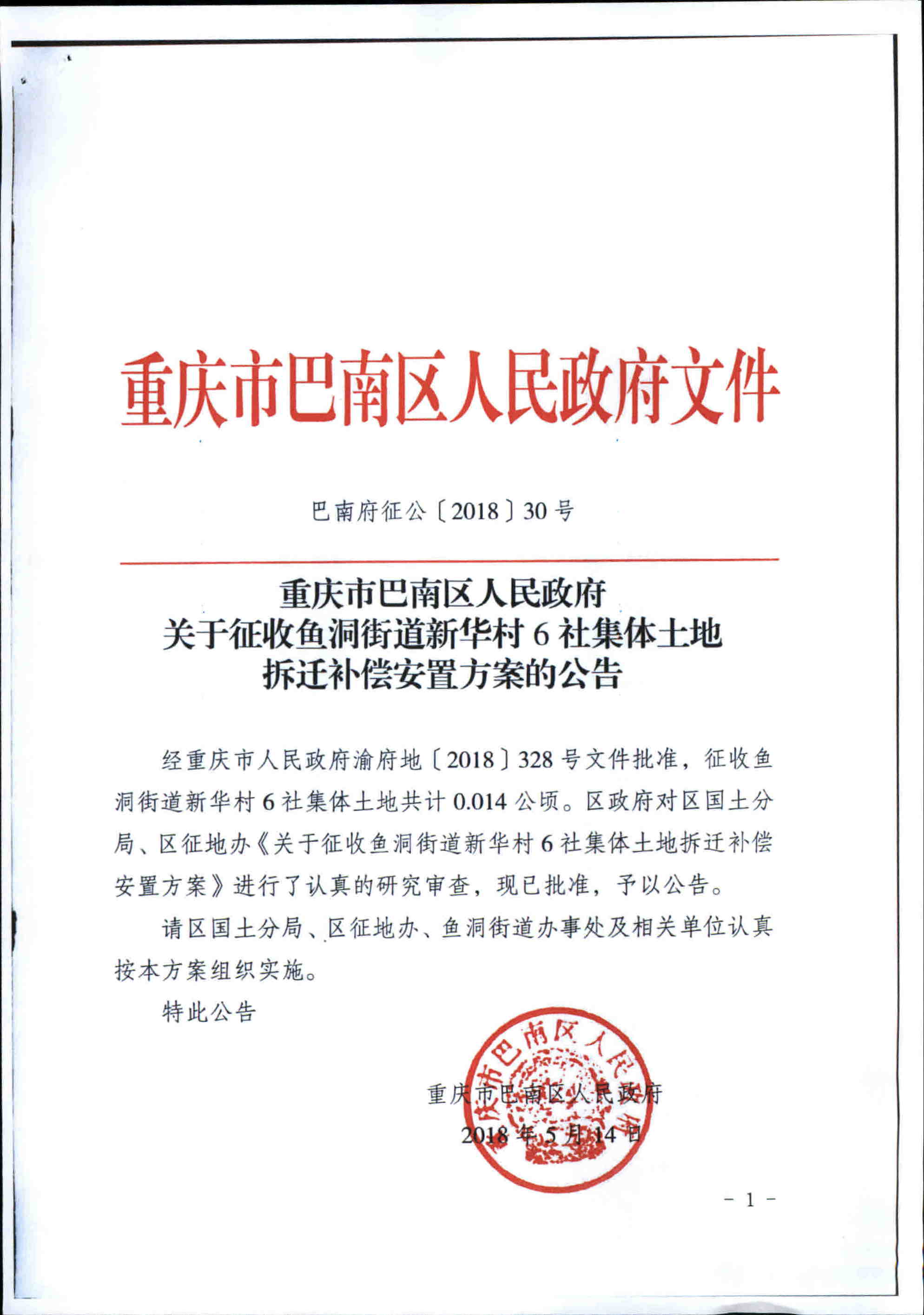 关于征收鱼洞街道新华村6社集体土地拆迁补偿安置方案的公告(巴南府征公〔2018〕30号)