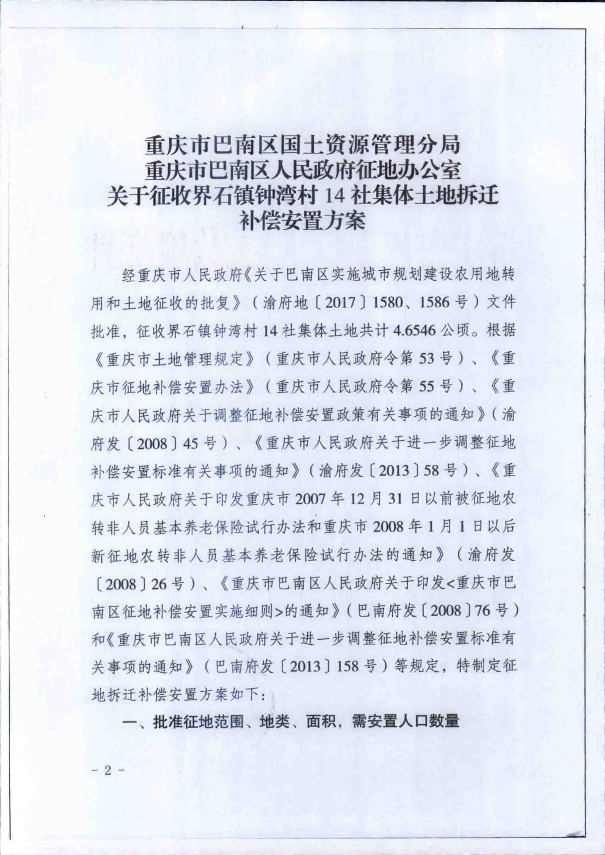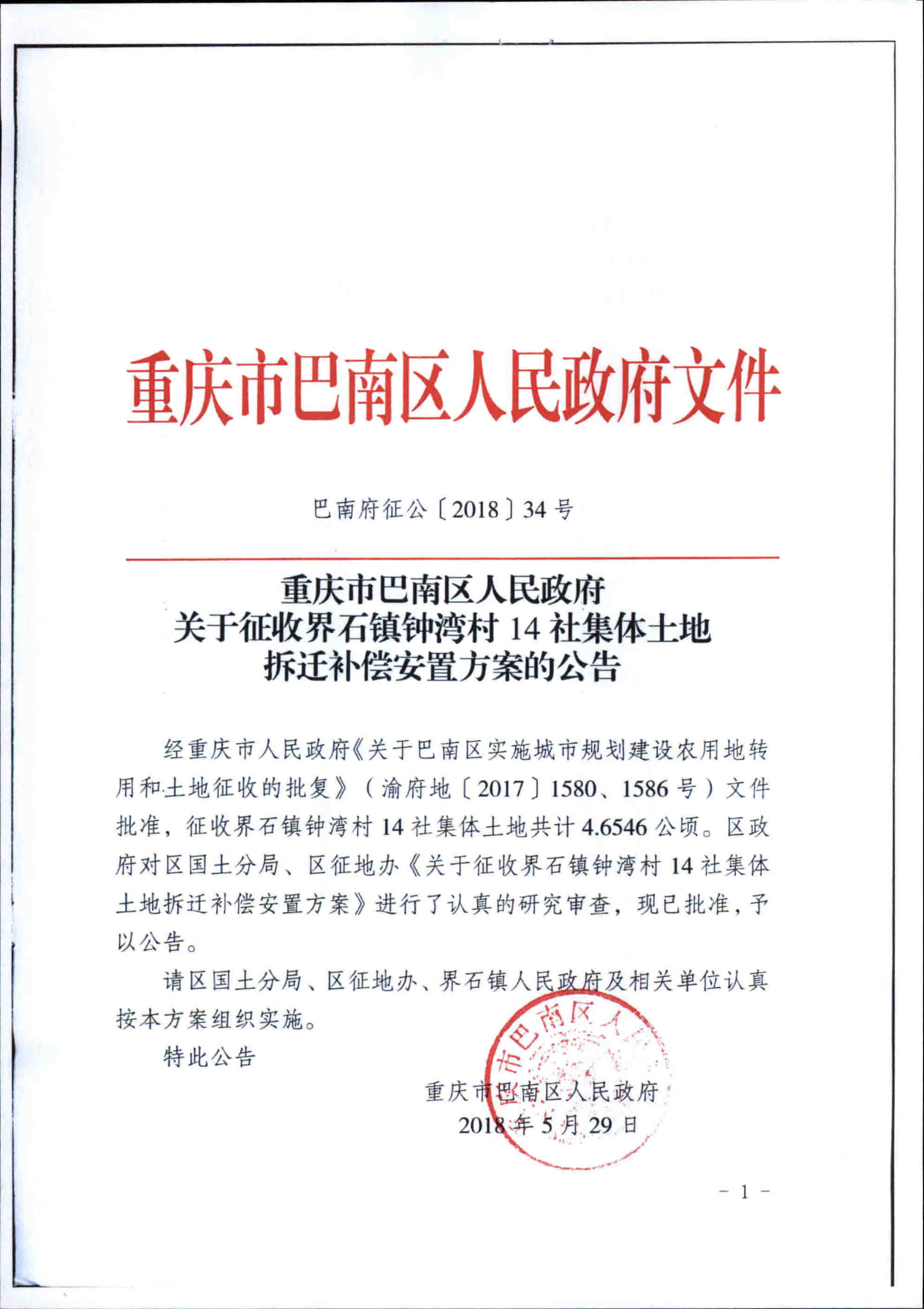 关于征收界石镇钟湾村14社集体土地拆迁补偿安置方案的公告(巴南府征公〔2018〕34号)