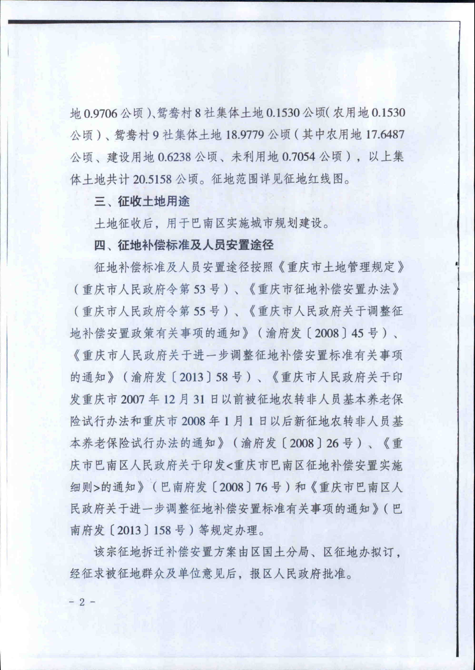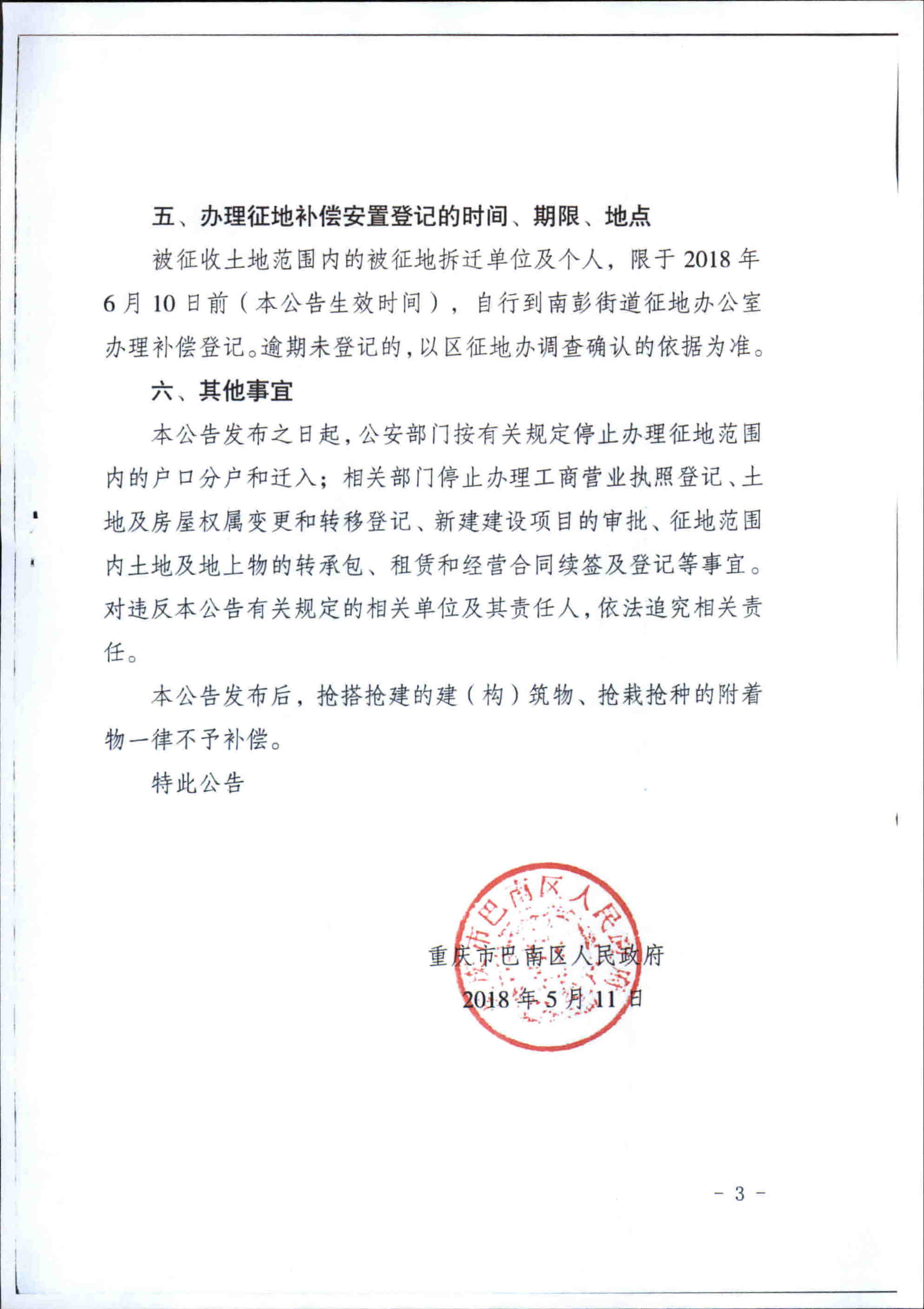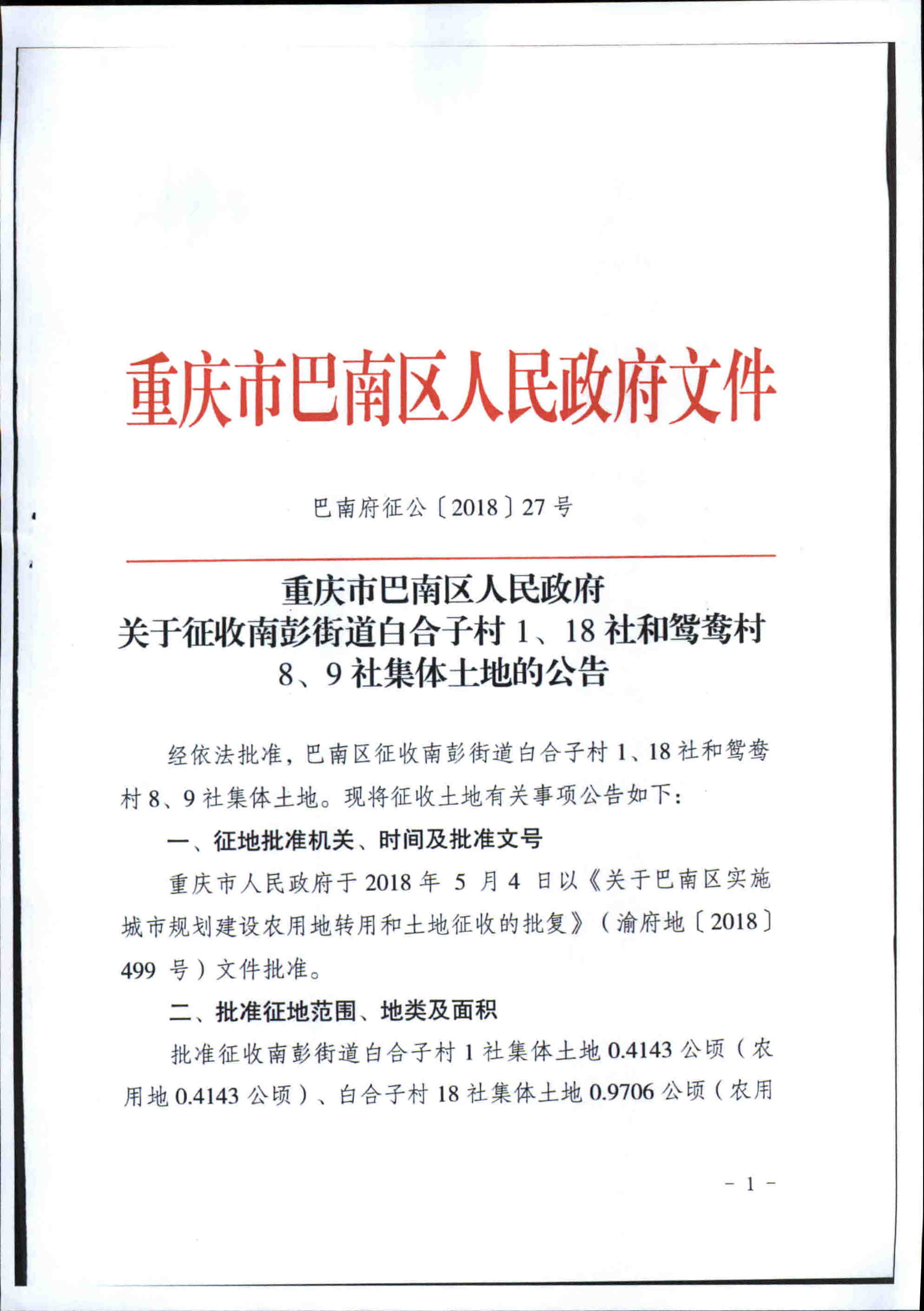关于征收南彭街道白合子村1、18社和鸳鸯村8、9社集体土地的公告(巴南府征公〔2018〕27号)