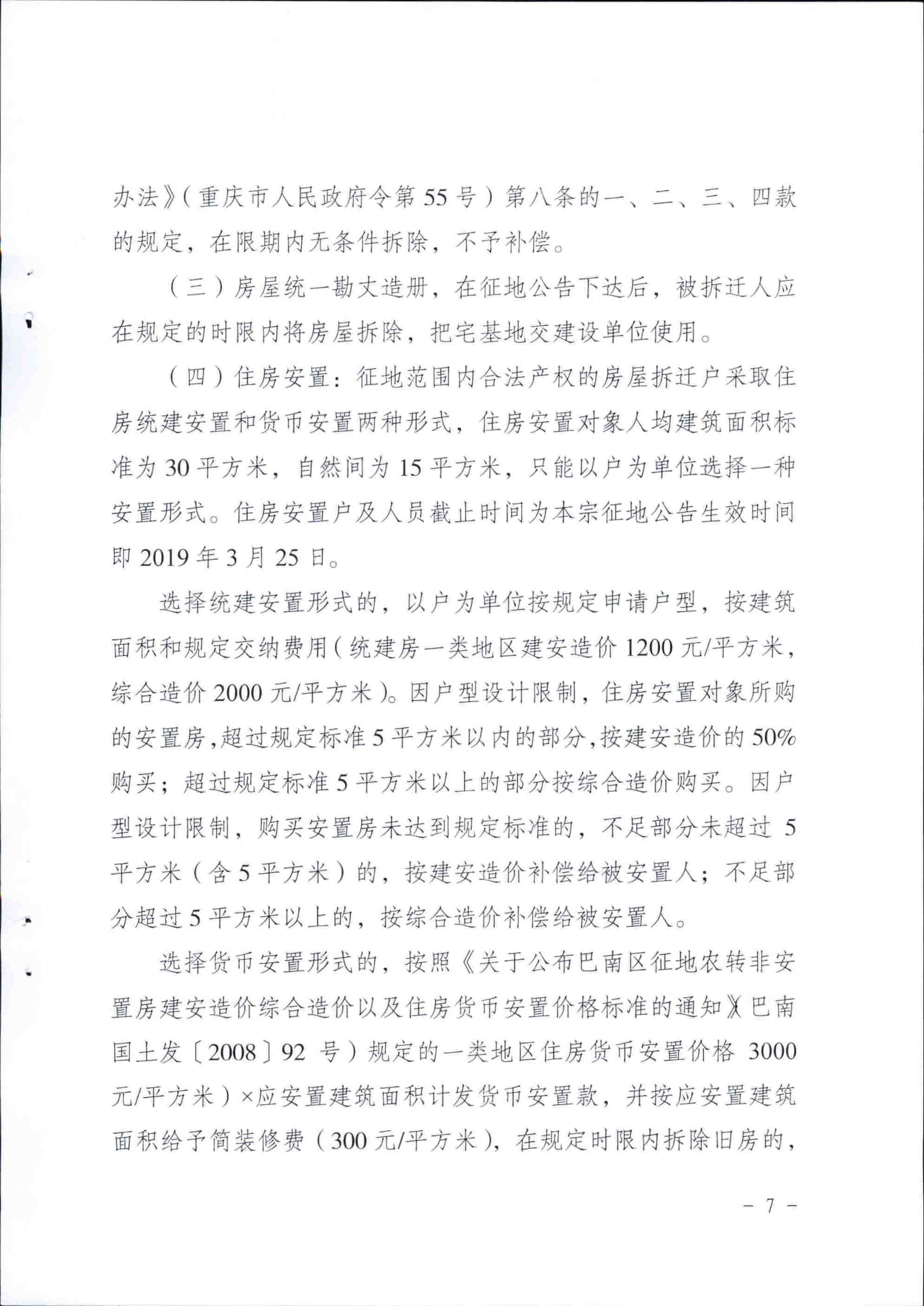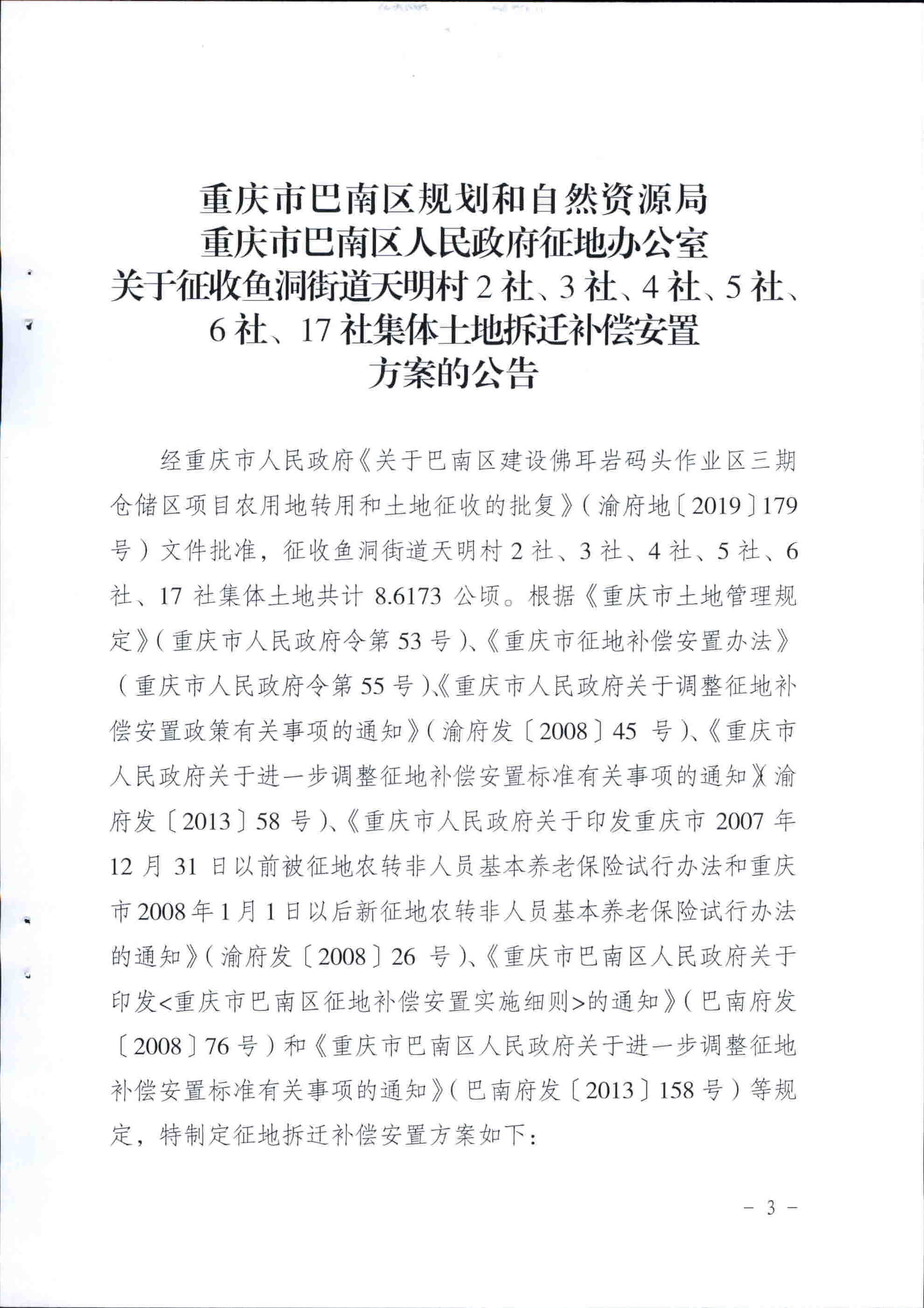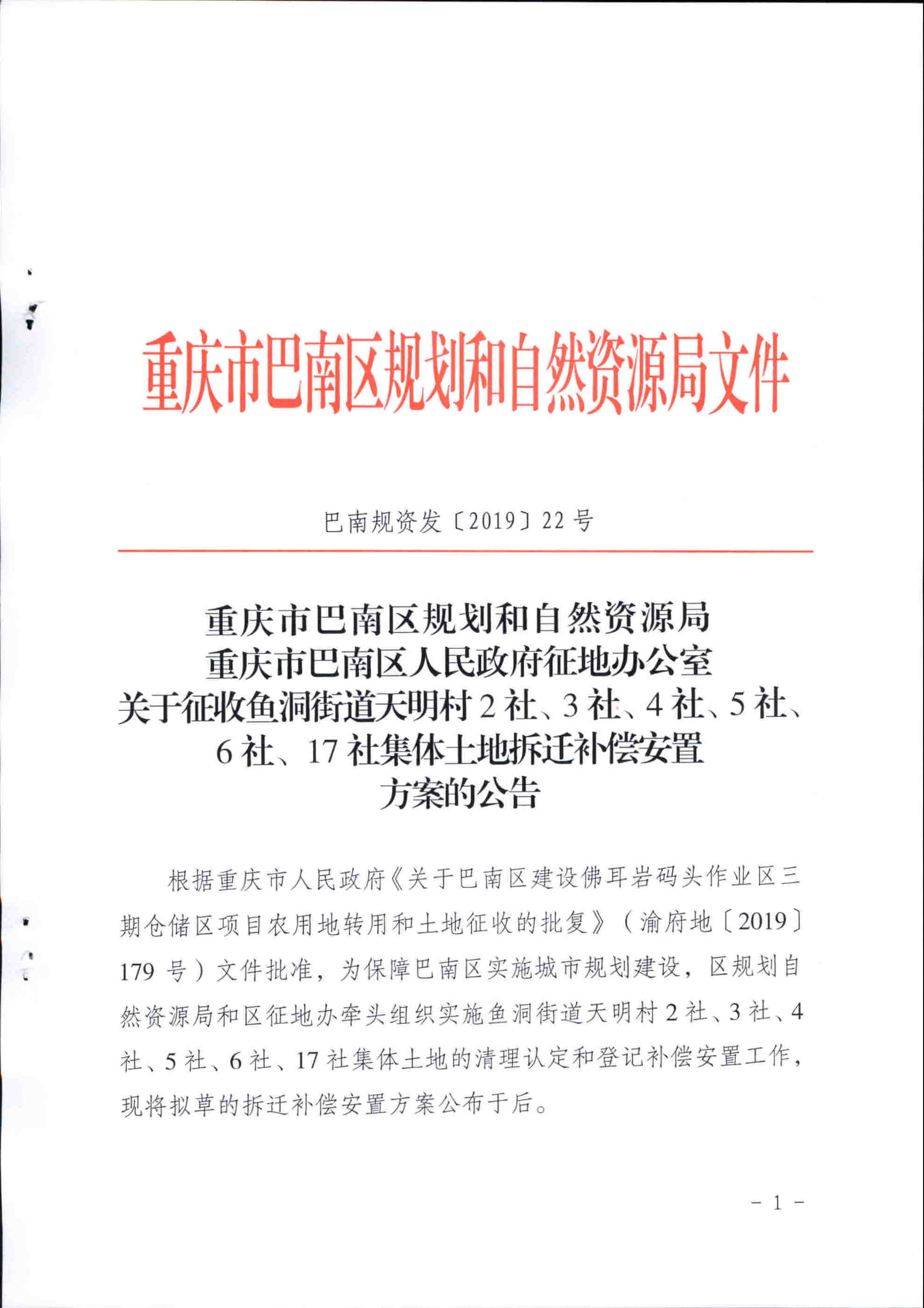 关于征收鱼洞天明村2、3、4、5、6、17社集体土地拆迁补偿安置方案的公告(巴南规资发〔2019〕22号)