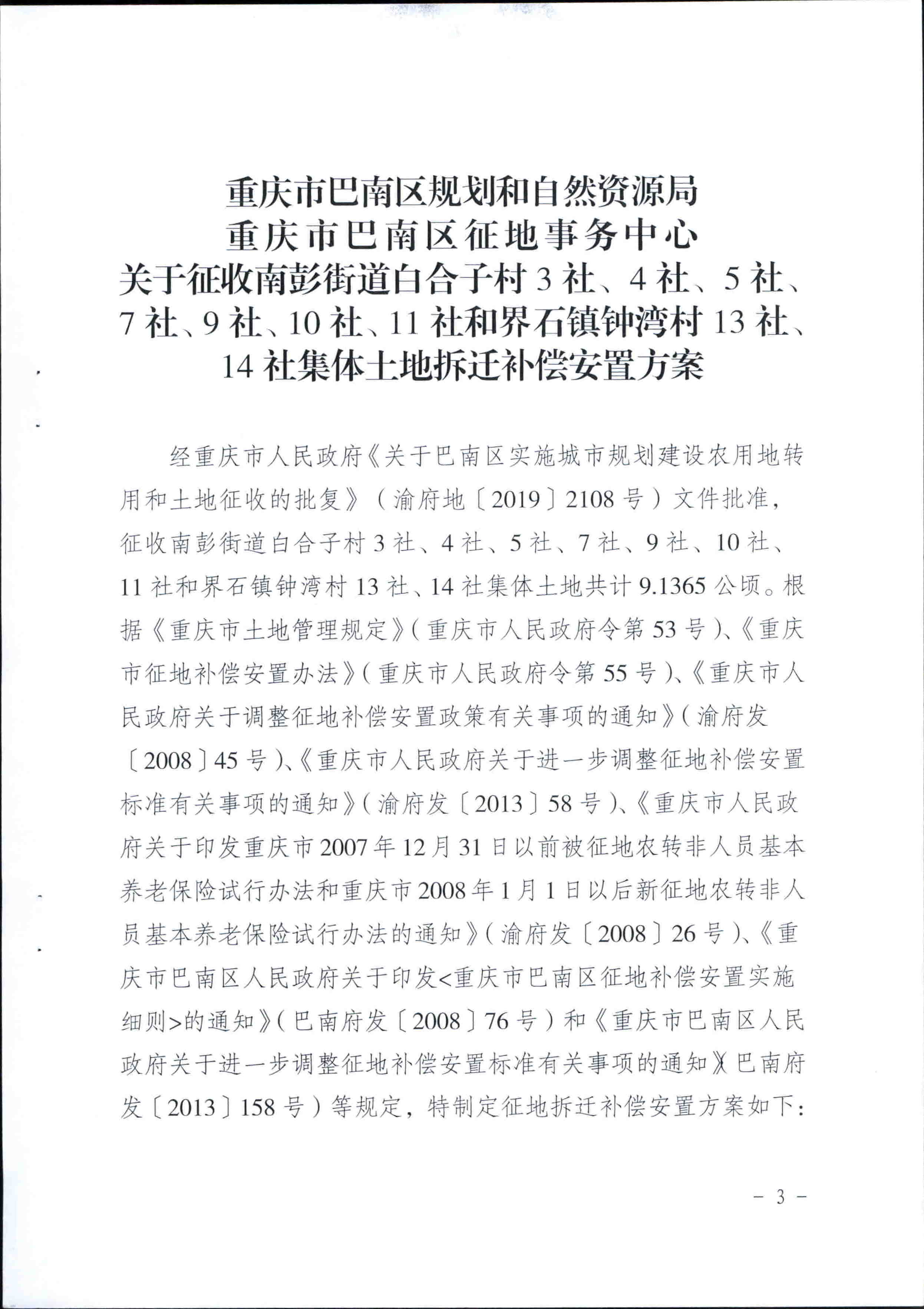 关于征收南彭街道白合子村3社、4社、5社、7社、9社、10社、11社和界石镇钟湾村13社、14社集体土地拆迁补偿安置方案的公告(巴南规资发〔2020〕23号)