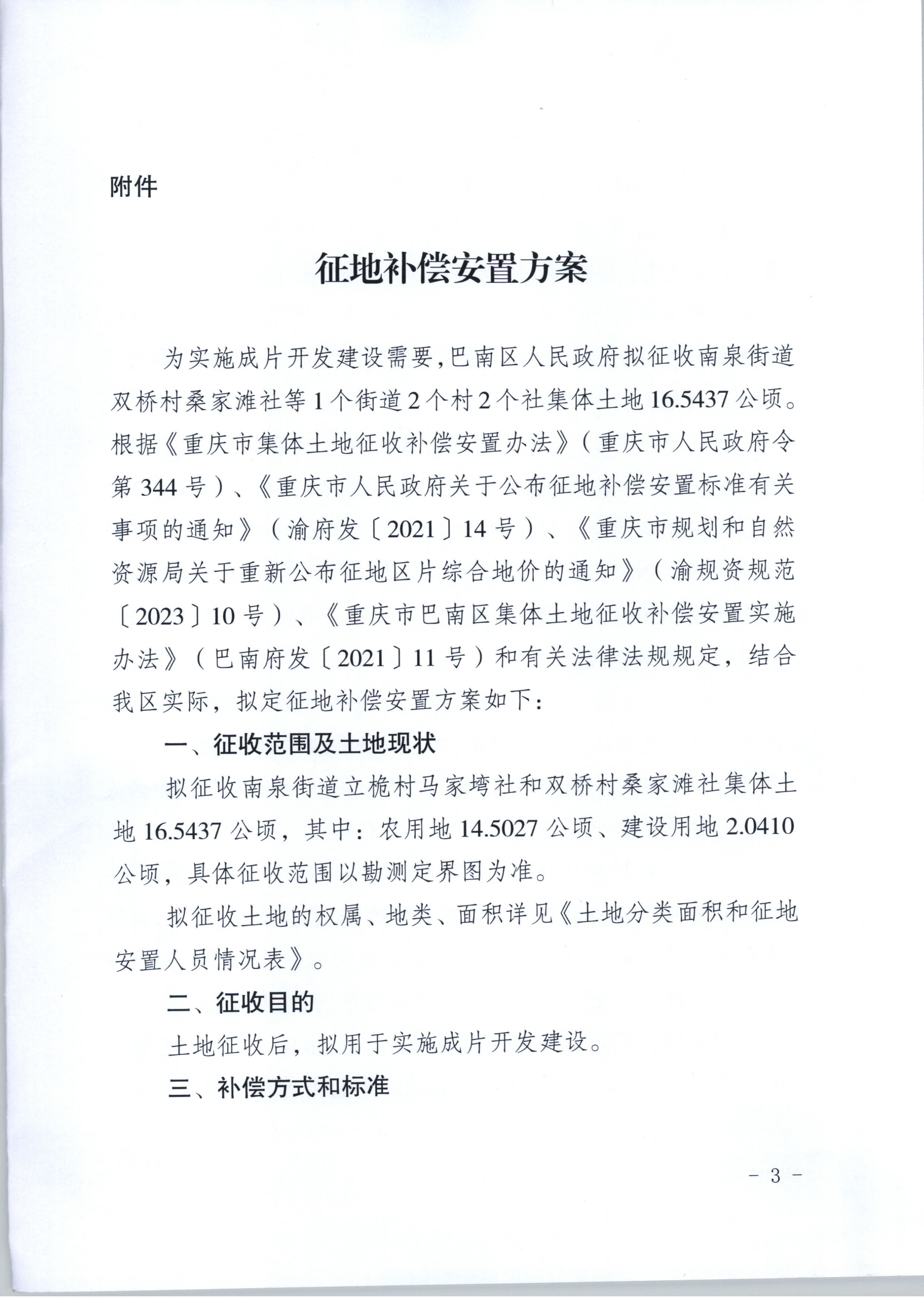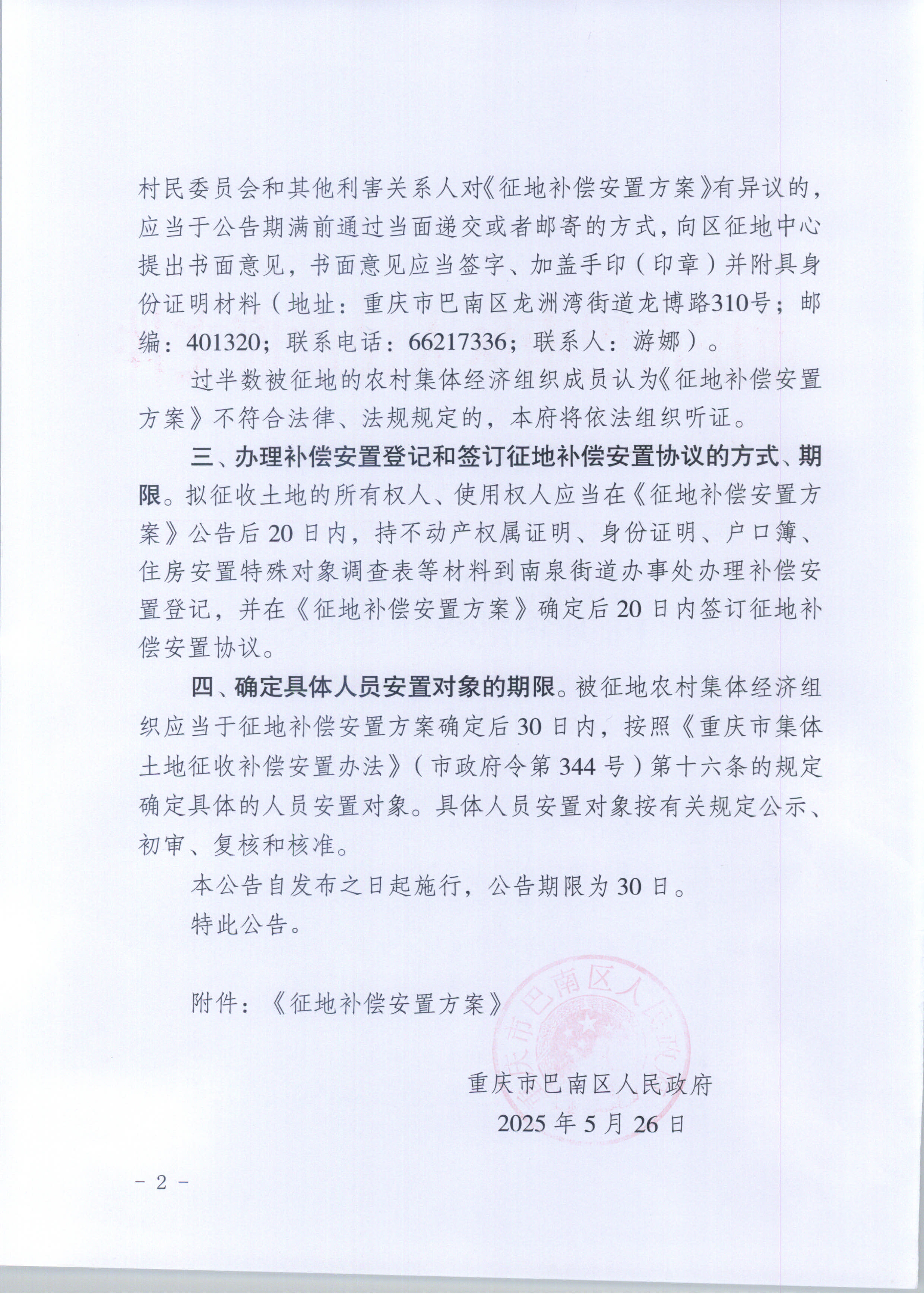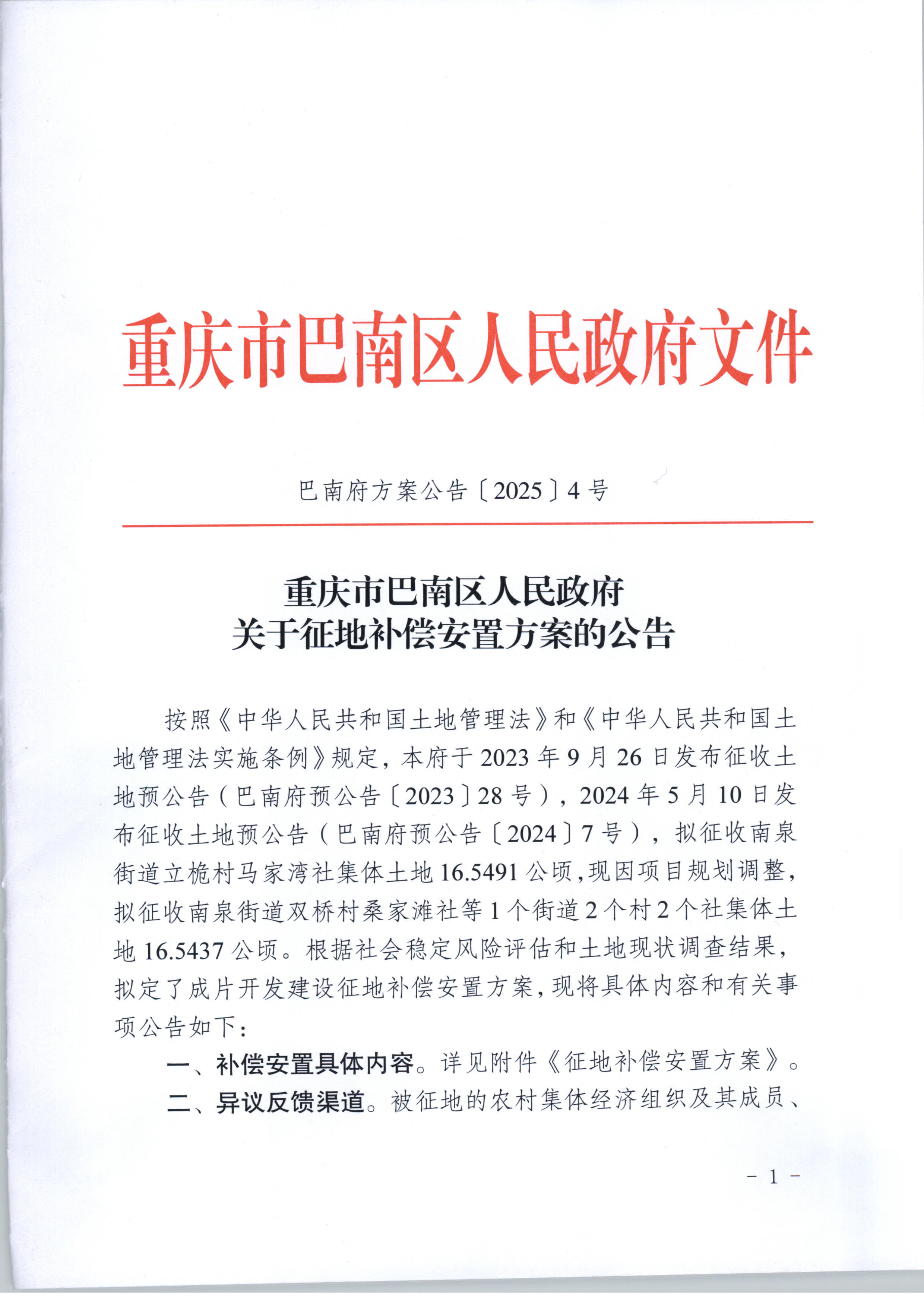 重庆市巴南区人民政府关于征地补偿安置方案的公告(巴南府方案公告〔2025〕4号)