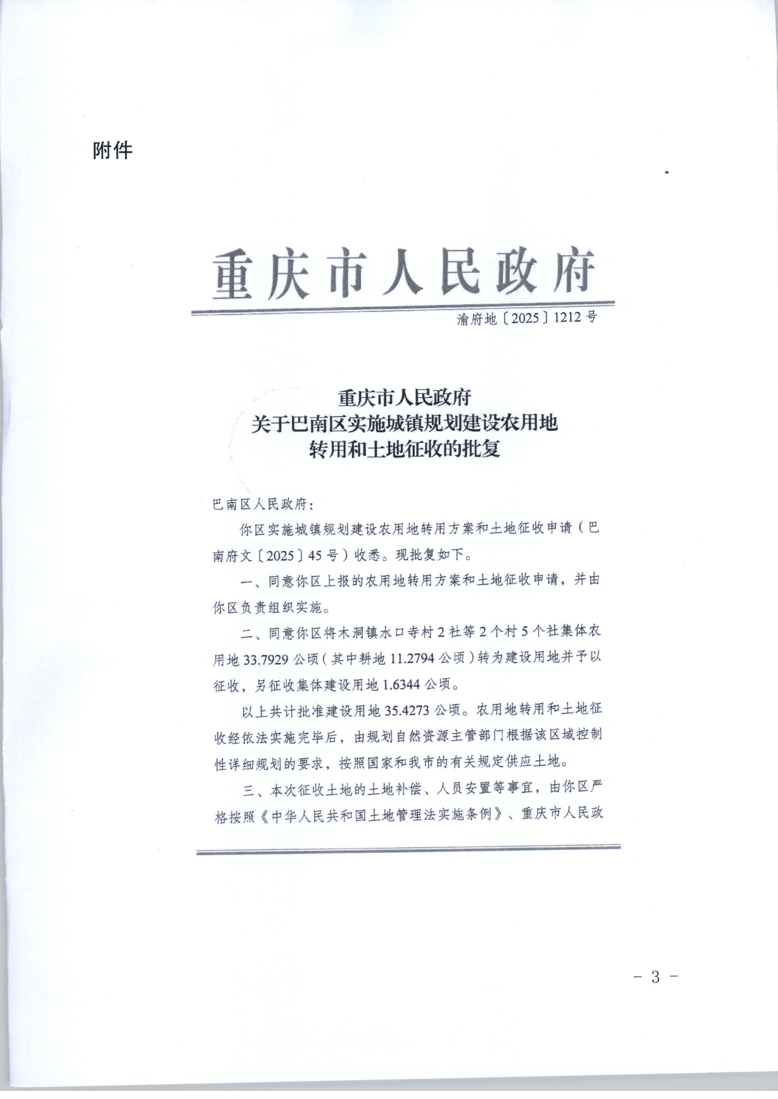 重庆市巴南区人民政府关于征收土地的公告(巴南府征地公告〔2025〕16号)
