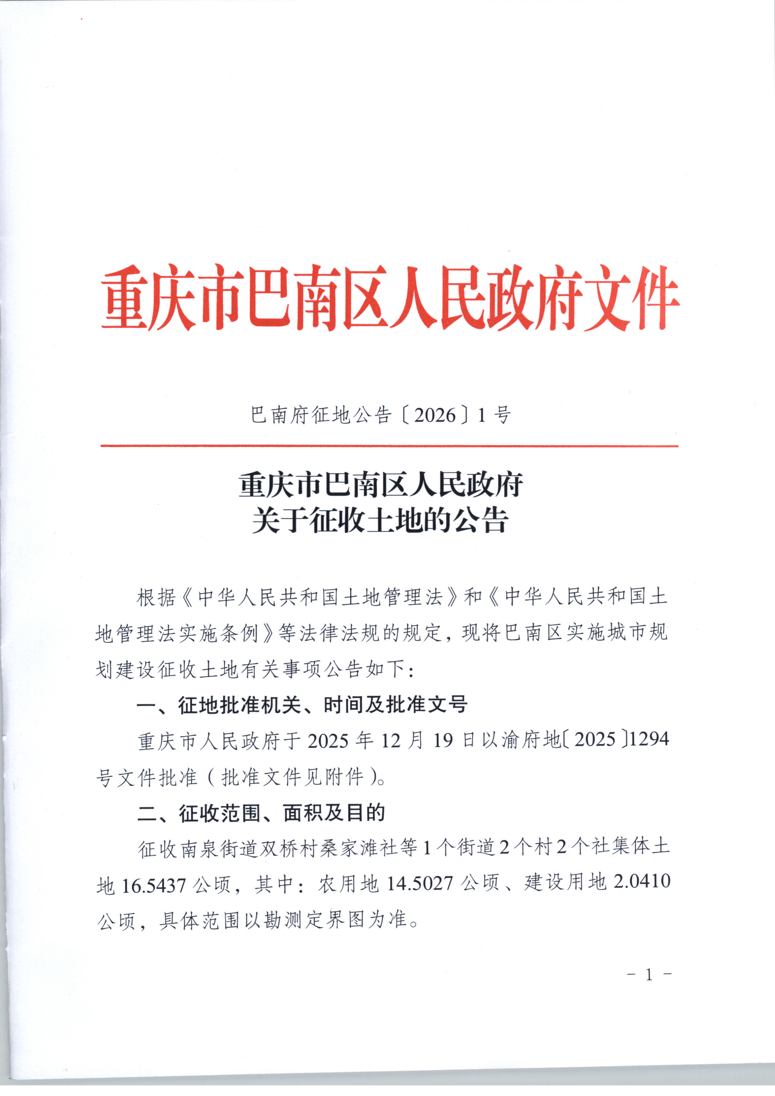 重庆市巴南区人民政府关于征收土地的公告(巴南府征地公告〔2026〕1号)