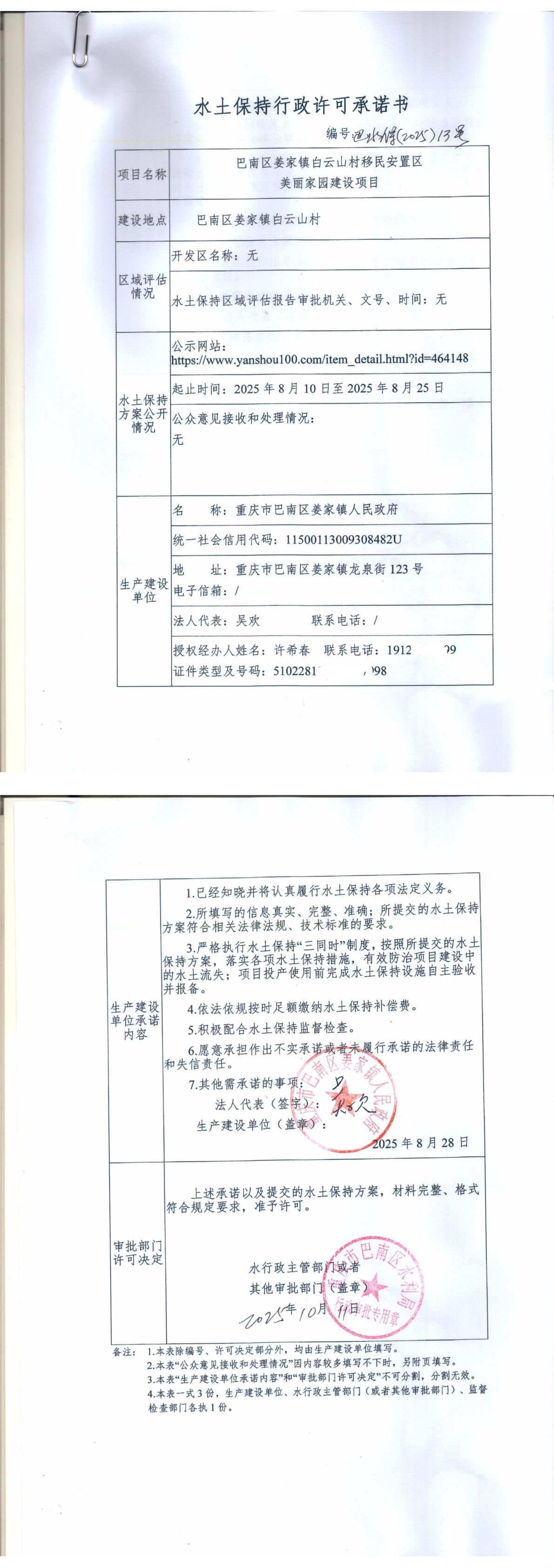 重庆市巴南区水利局关于姜家镇白云山村移民安置区美丽家园建设项目水土保持行政许可承诺书