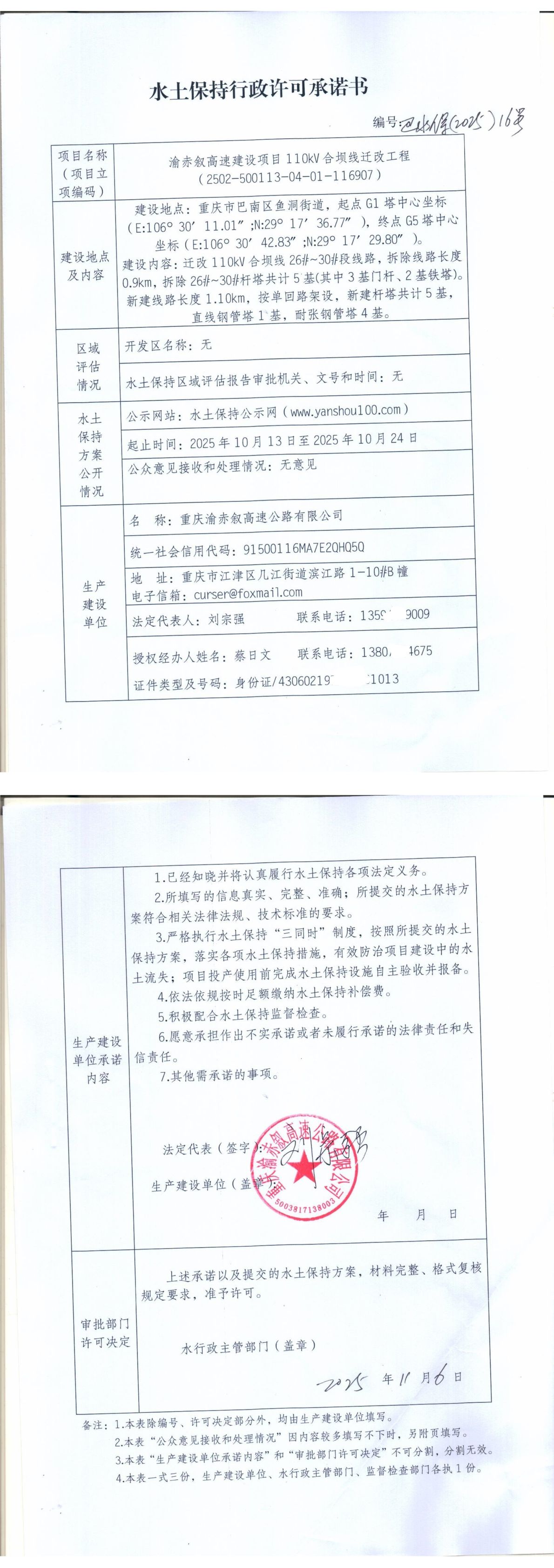 重庆市巴南区水利局关于渝赤叙高速建设项目110KV合坝线迁改工程水土保持行政许可承诺书