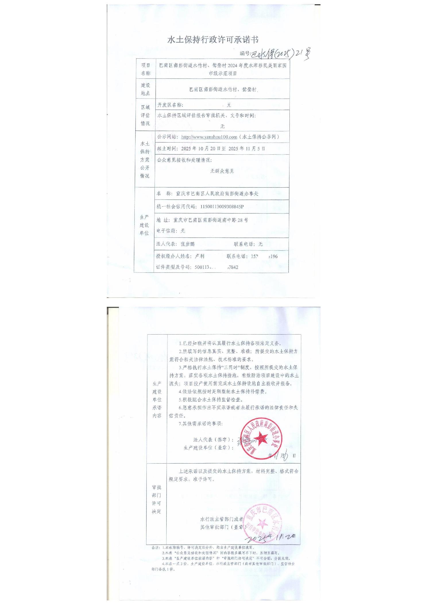 重庆市巴南区水利局关于南彭街道将塔落村、水竹村2024年度水库移民美丽家园市级示范项目水土保持行政许可承诺书