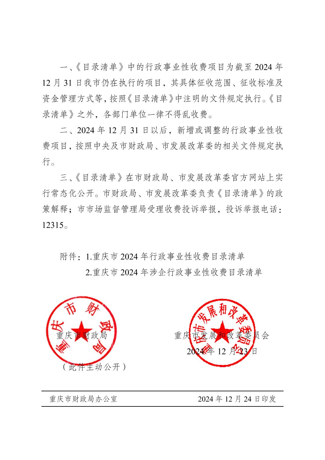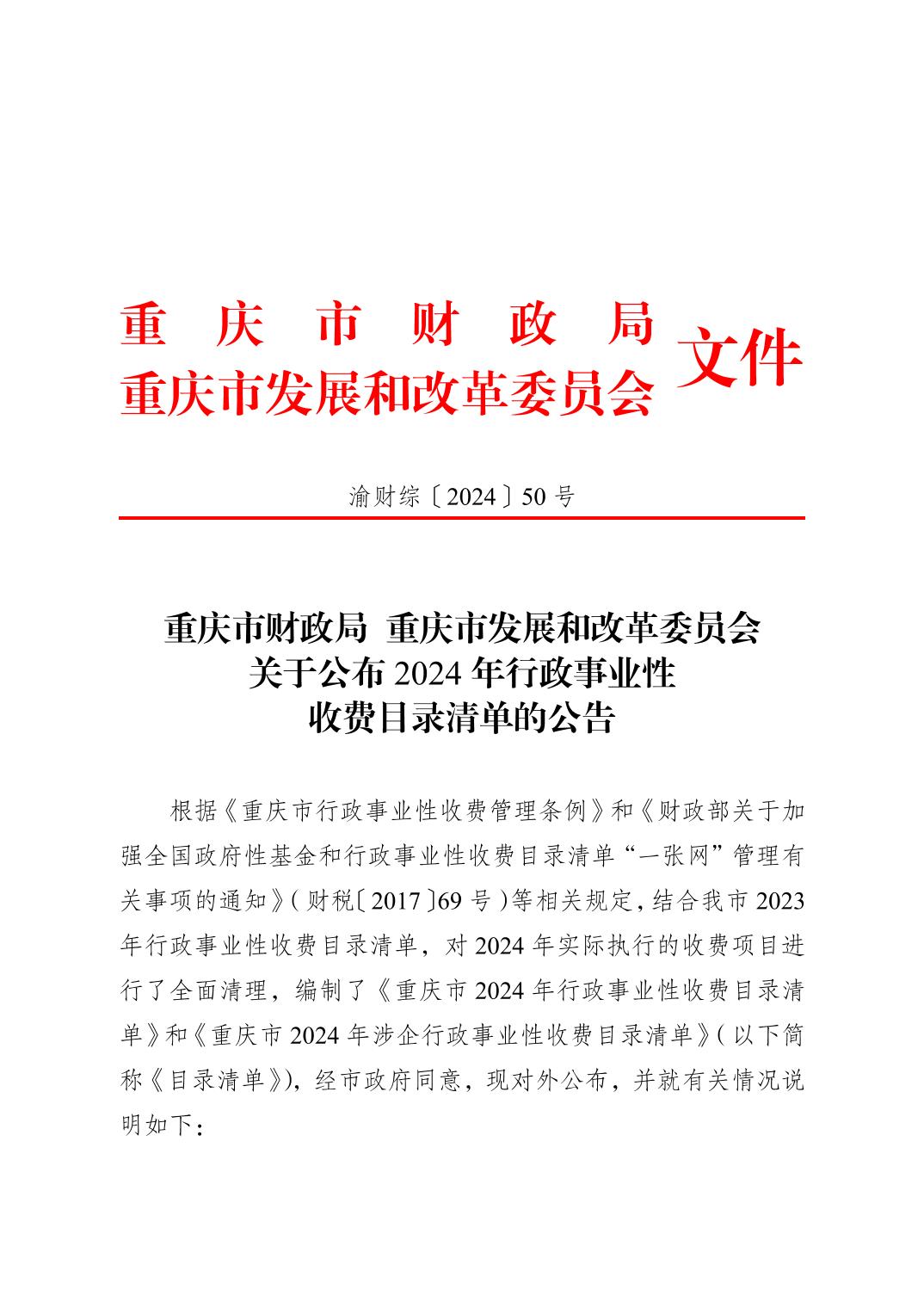 重庆市财政局 重庆市发展和改革委员会关于公布2024年行政事业性收费目录清单的公告