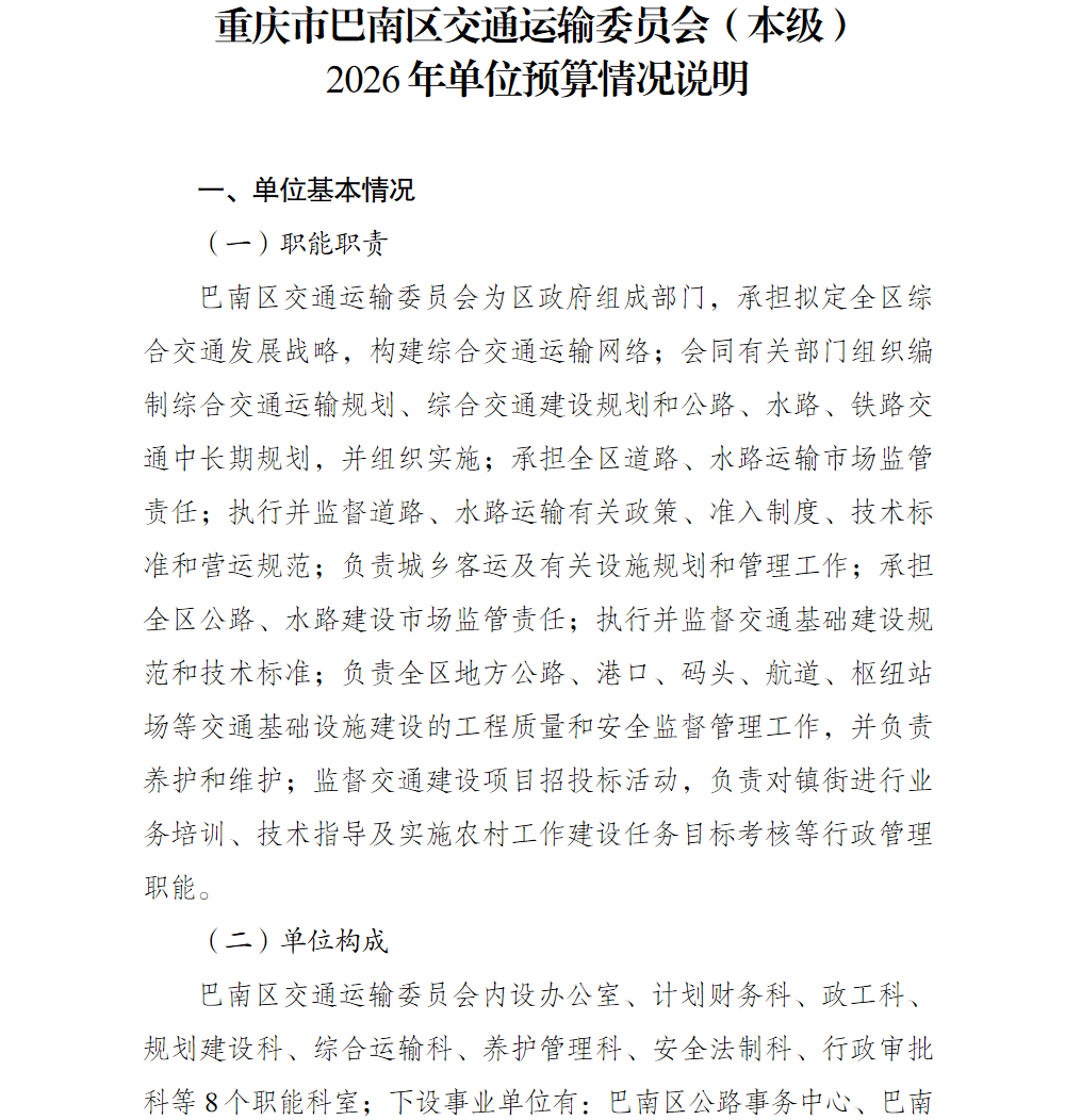 重庆市巴南区交通运输委员会2026年部门预算情况说明(汇总级和本级)