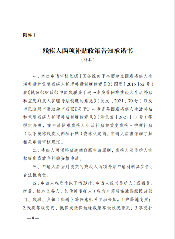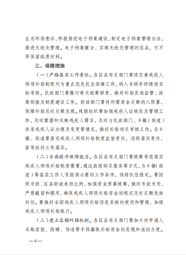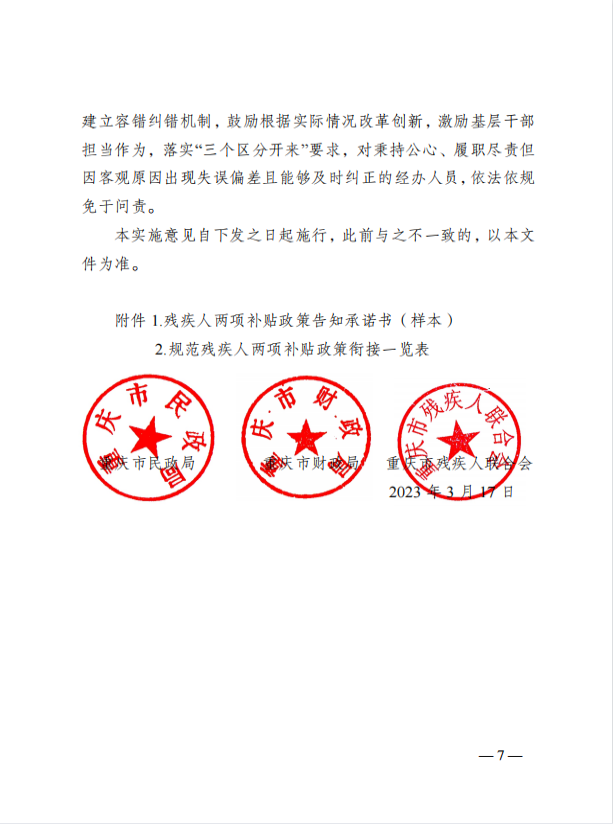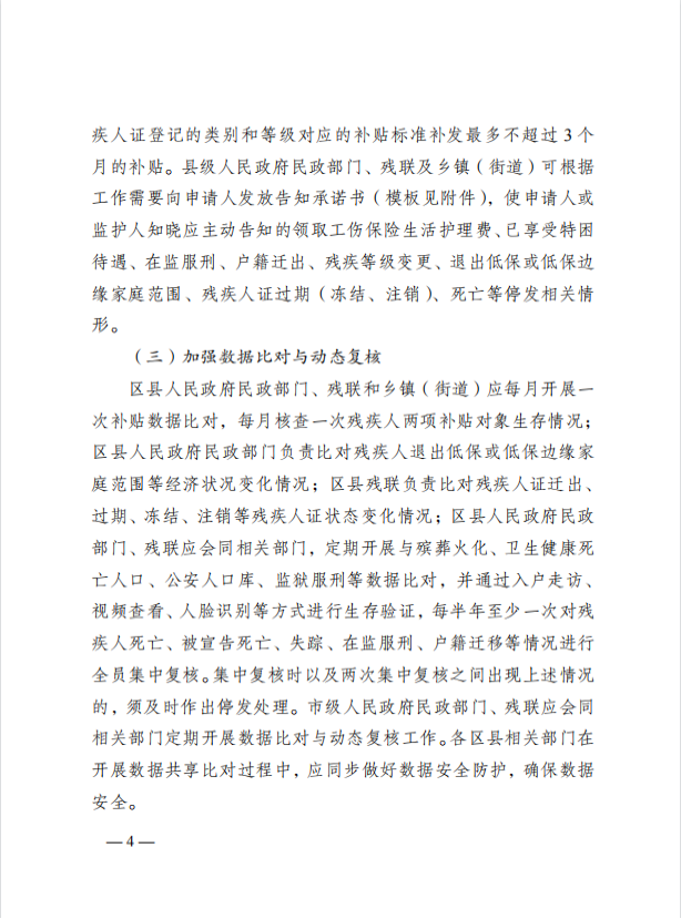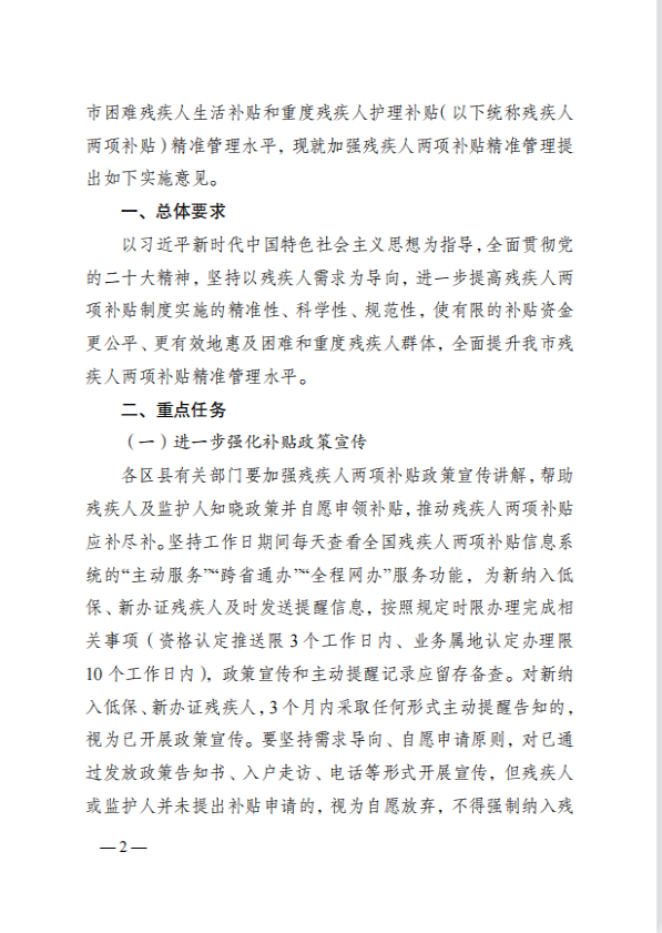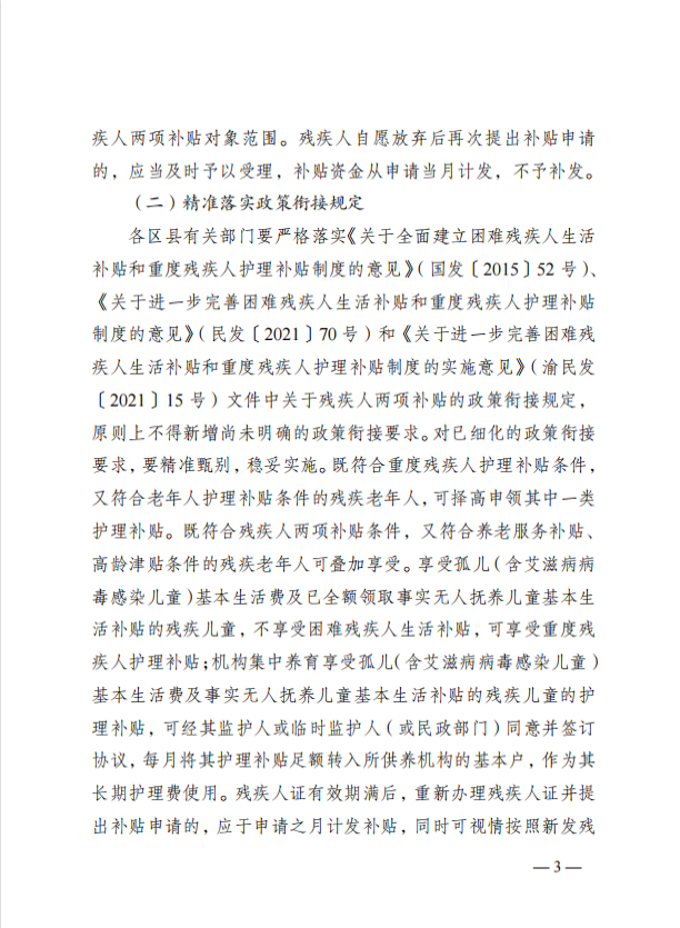 现将重庆市民政局、重庆市财政局、重庆市残疾人联合会《关于加强残疾人两项补贴精准管理的实施意见》(渝民发〔2023〕4号)转发你们,请认真贯彻执行。
