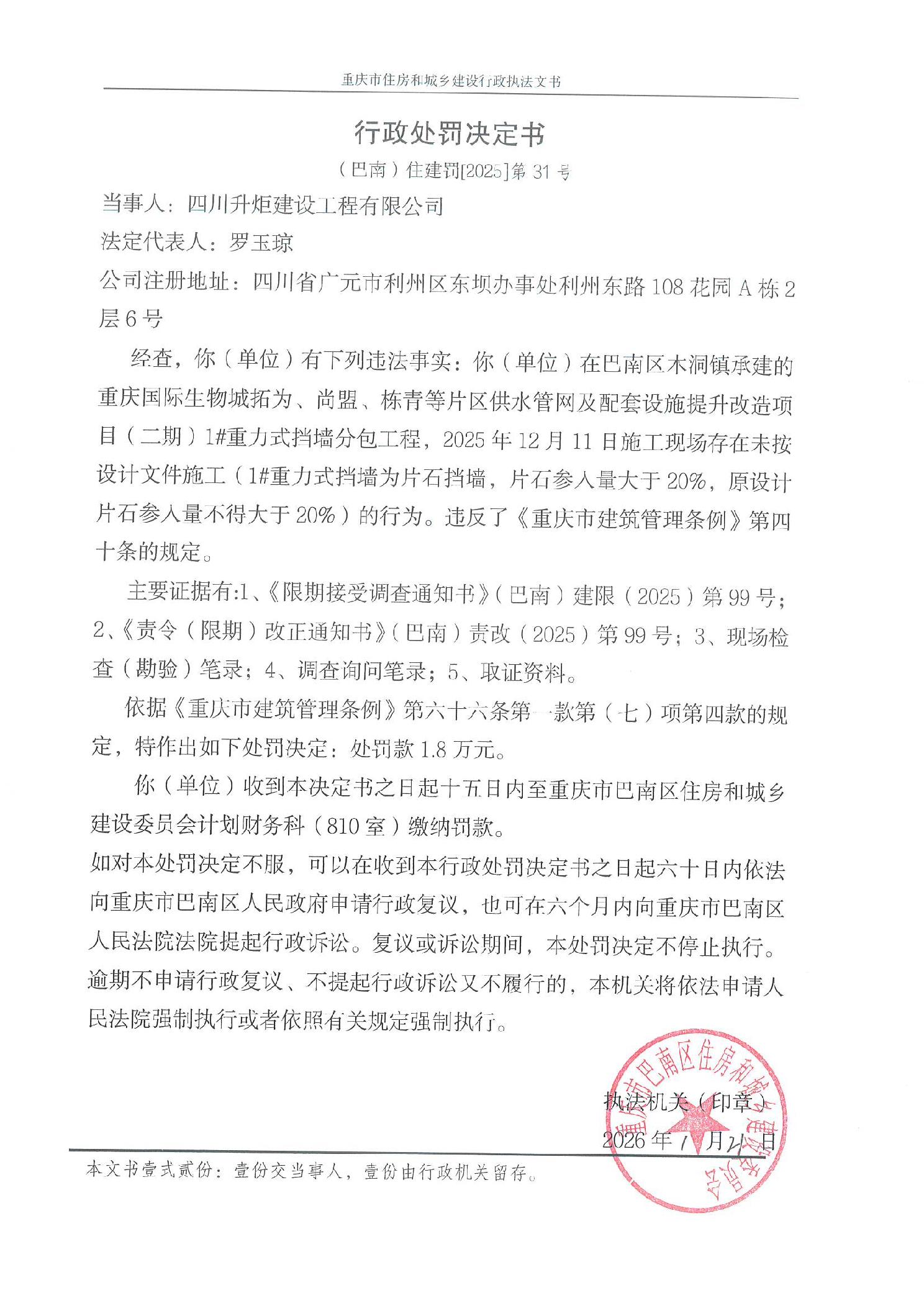 行政处罚决定书(巴南)住建罚【2025】第31号