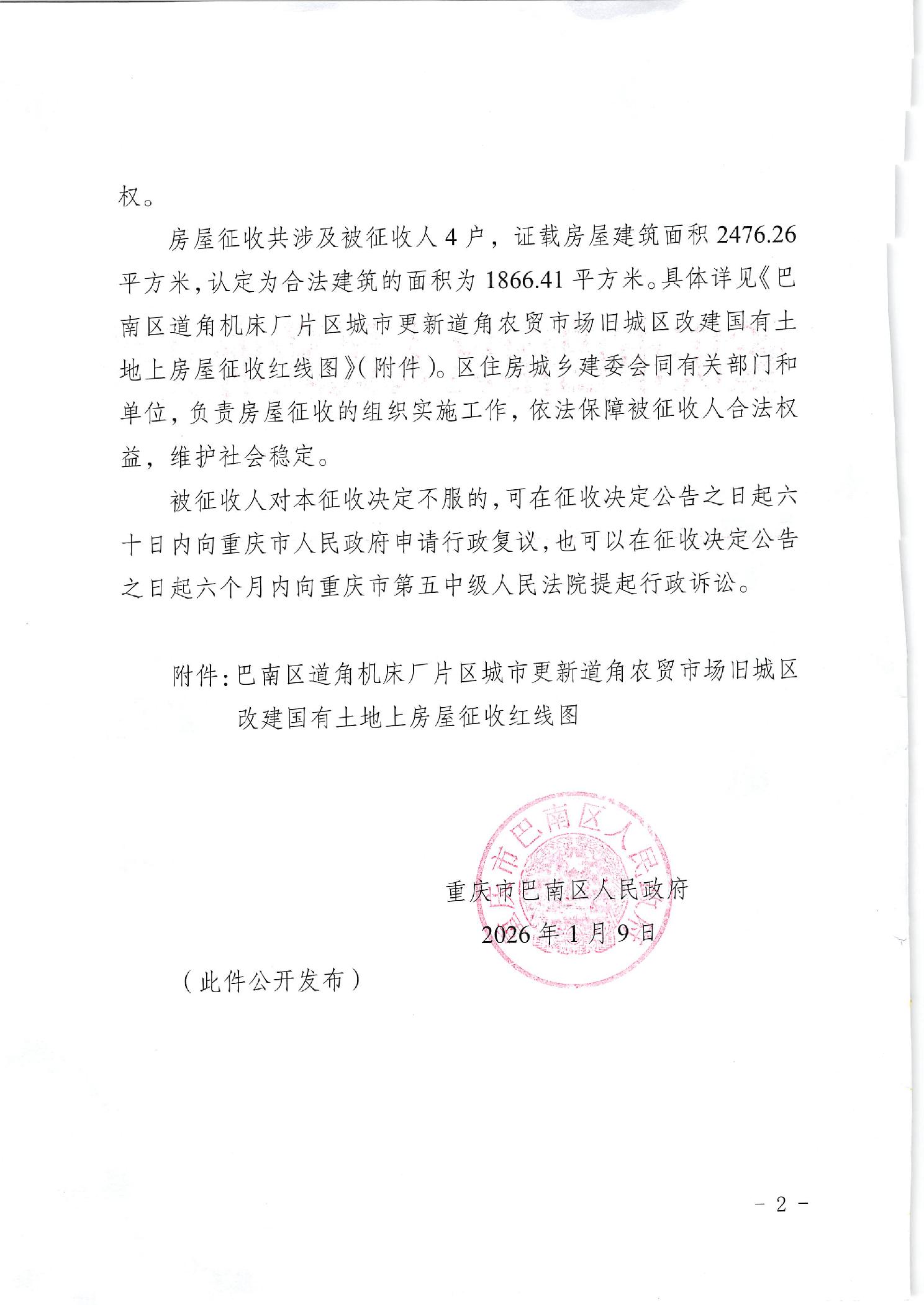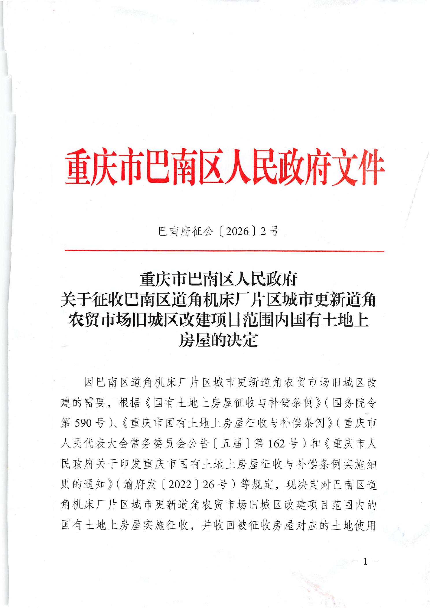 重庆市巴南区人民政府关于征收巴南区道角机床厂片区城市更新道角农贸市场旧城区改建项目范围内国有土地上房屋的决定(巴南府征公〔2026〕2号)