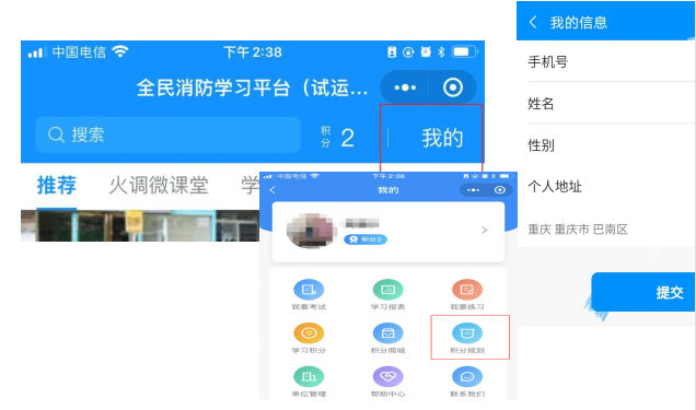 点击右上角“我的”,根据实际情况依次填写个人详细信息并提交。其中,个人地址一定要填写为“重庆市巴南区”。