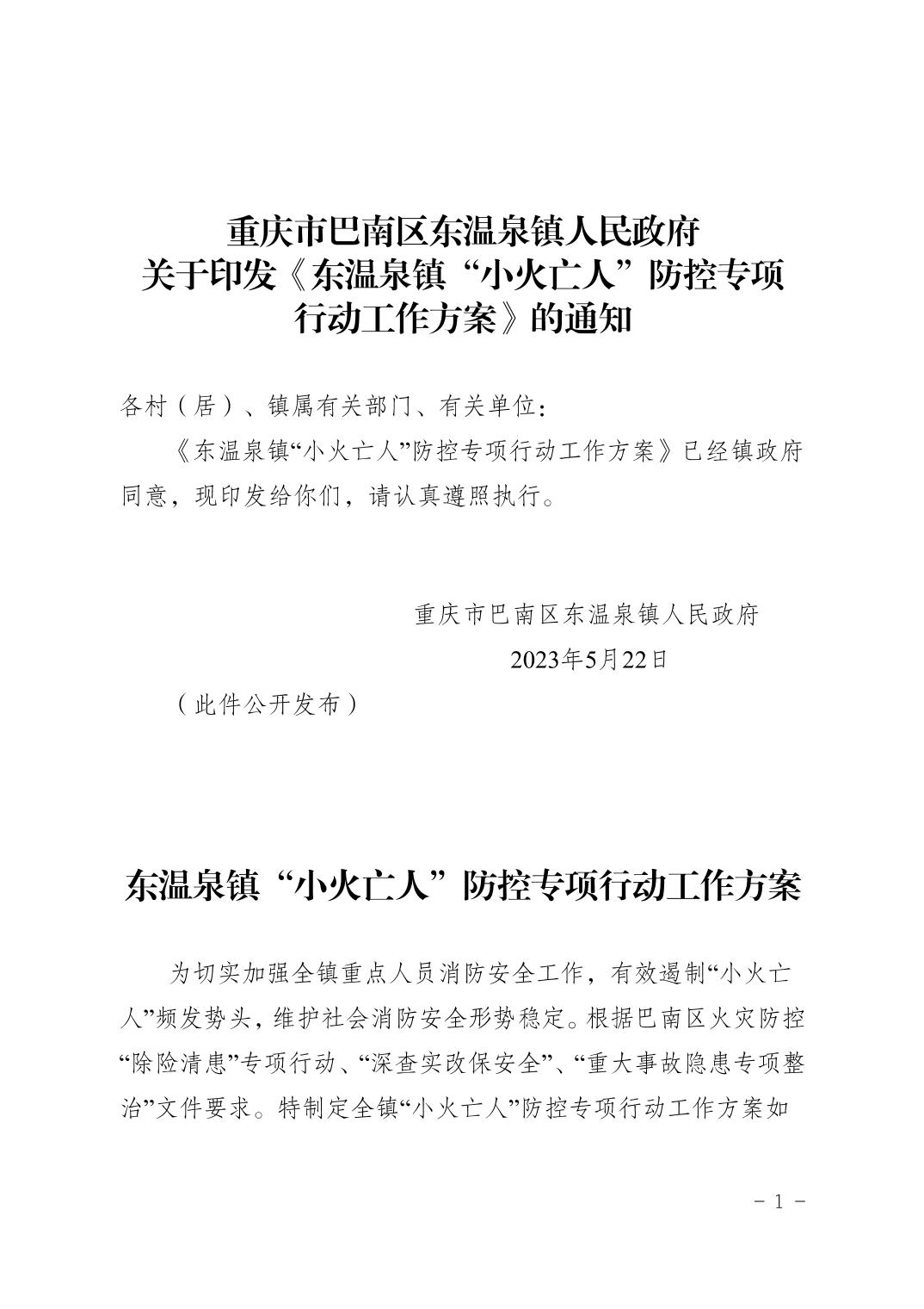 重庆市巴南区东温泉镇人民政府关于印发《东温泉镇“小火亡人”防控专项 行动工作方案》的通知