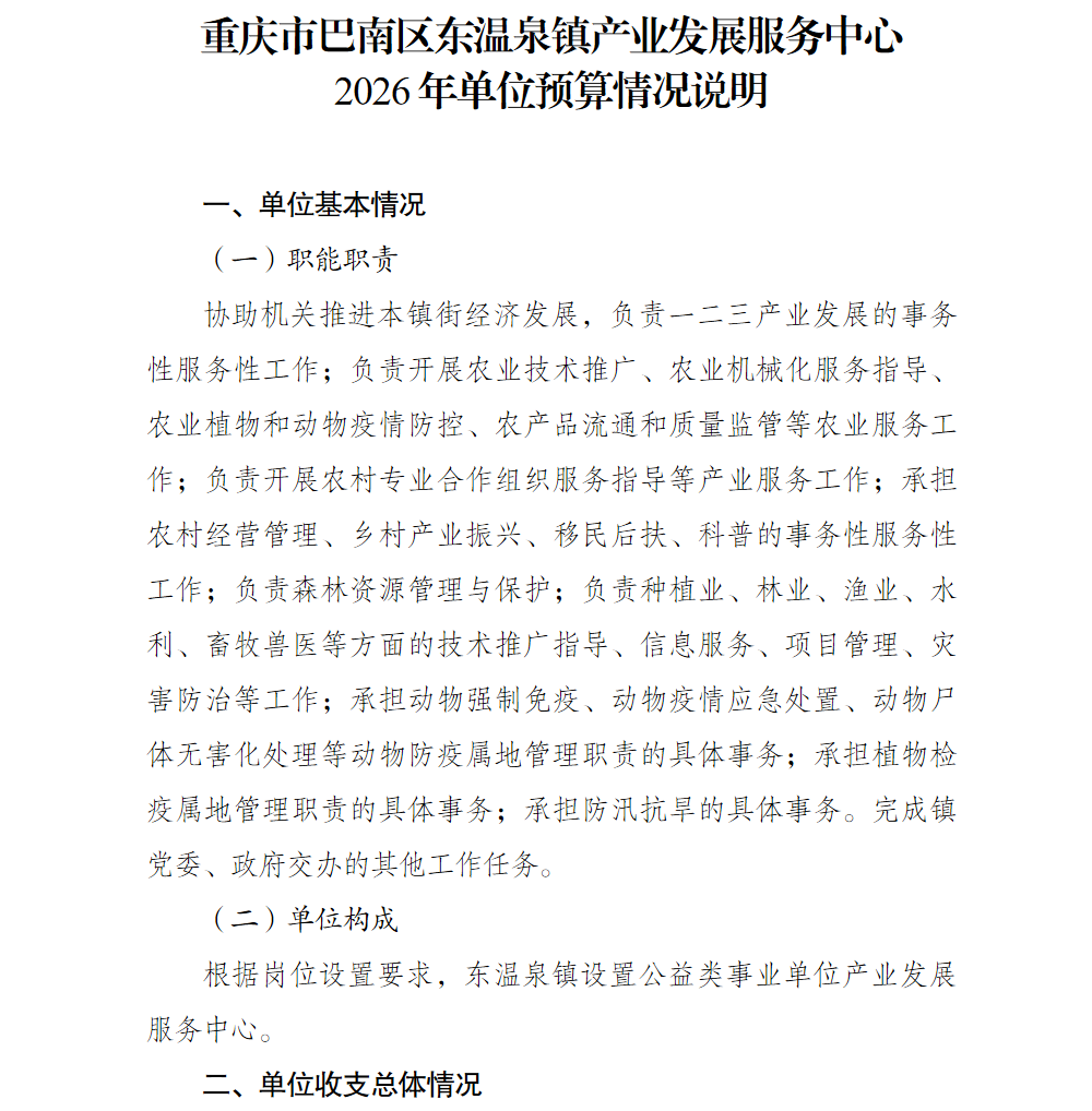 重庆市巴南区东温泉镇产业发展服务中心2026年单位预算情况说明
