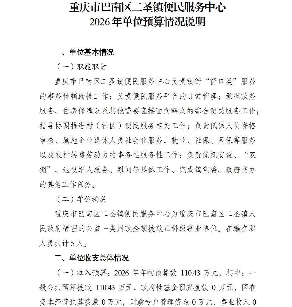 重庆市巴南区二圣镇便民服务中心2026年单位预算情况说明