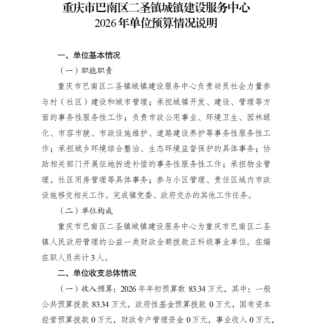 重庆市巴南区二圣镇城镇建设服务中心2026年单位预算情况说明