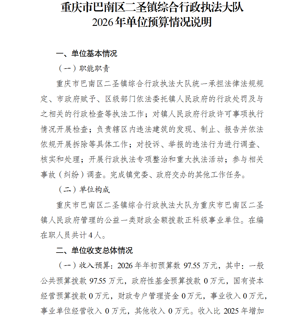 重庆市巴南区二圣镇综合行政执法大队2026年单位预算情况说明